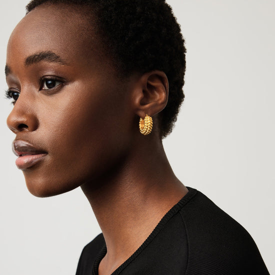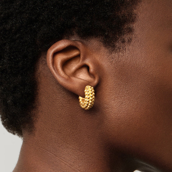 Everyday statement hoops inspired by Colombia. These best selling hoop earrings with unique bobble detailing have a light-reflecting 18k Gold plated finish. Add to your ear stack with chunky gold huggies.