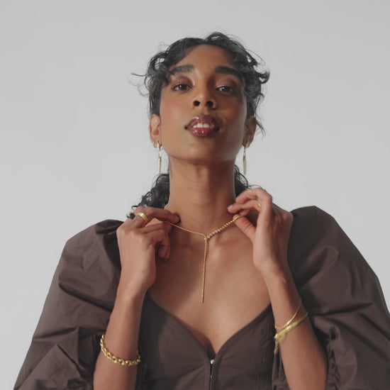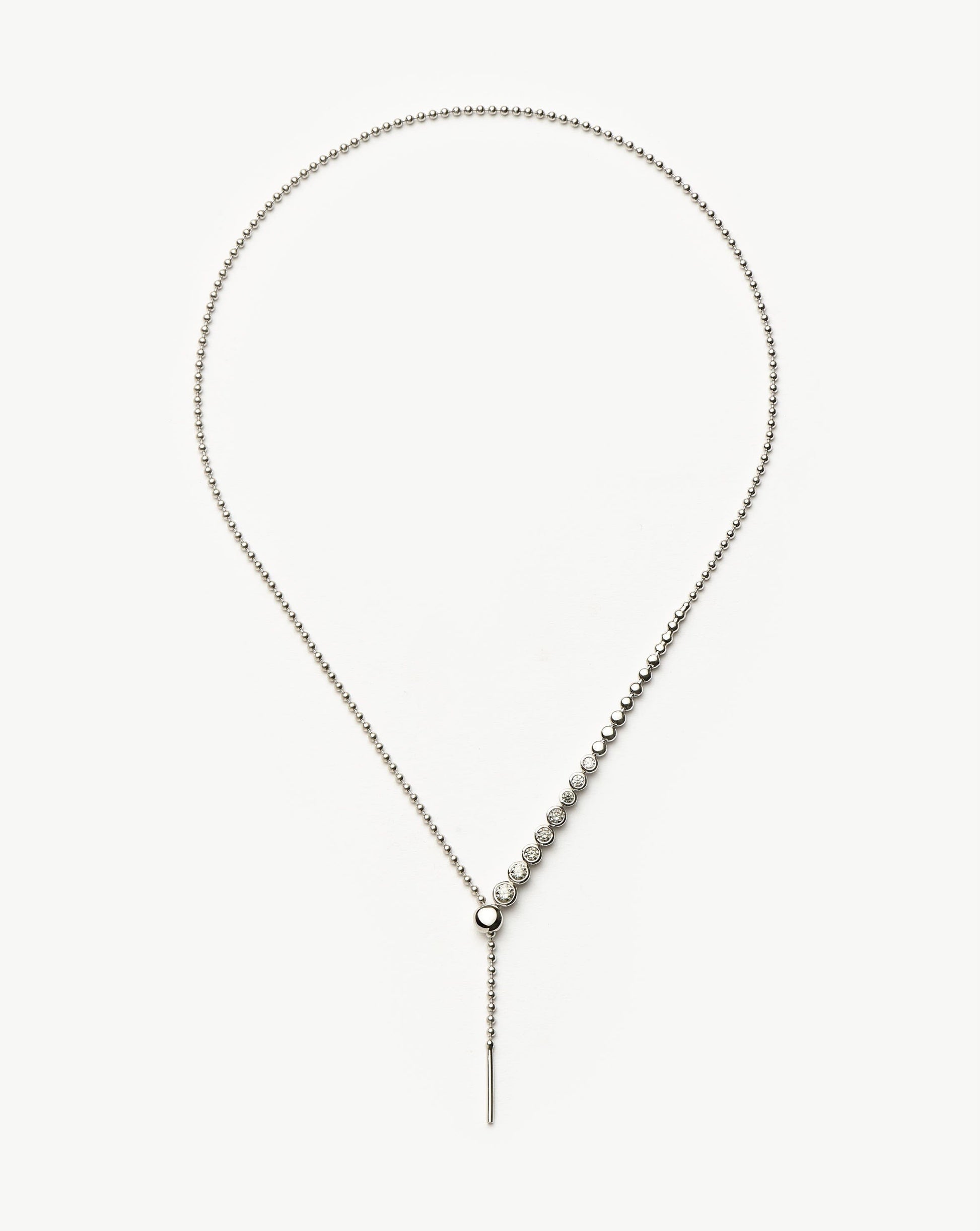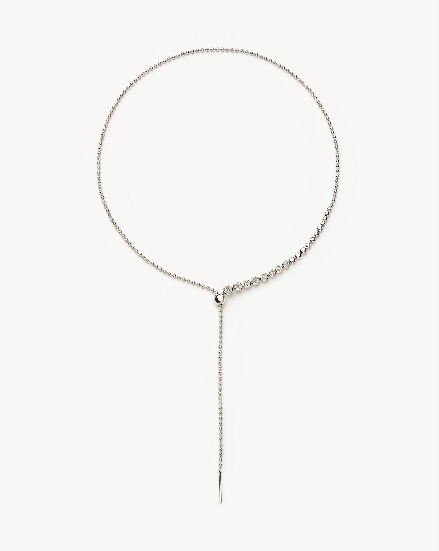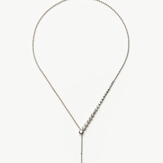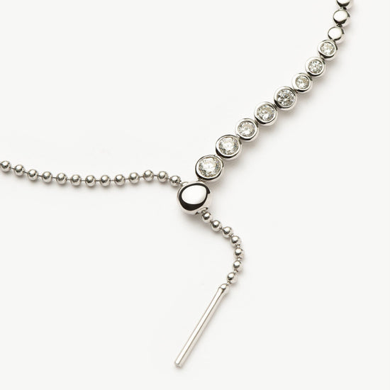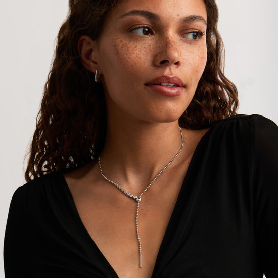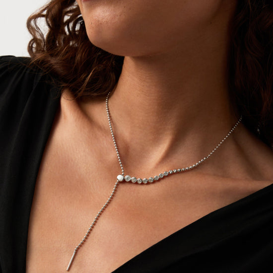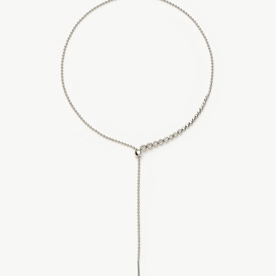 This statement silver lariat necklace features rounded cubic zirconia stones and a slider for added versatility. Wear as a choker, medium necklace, or reversible for a plain silver look.