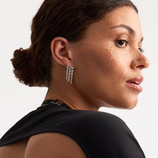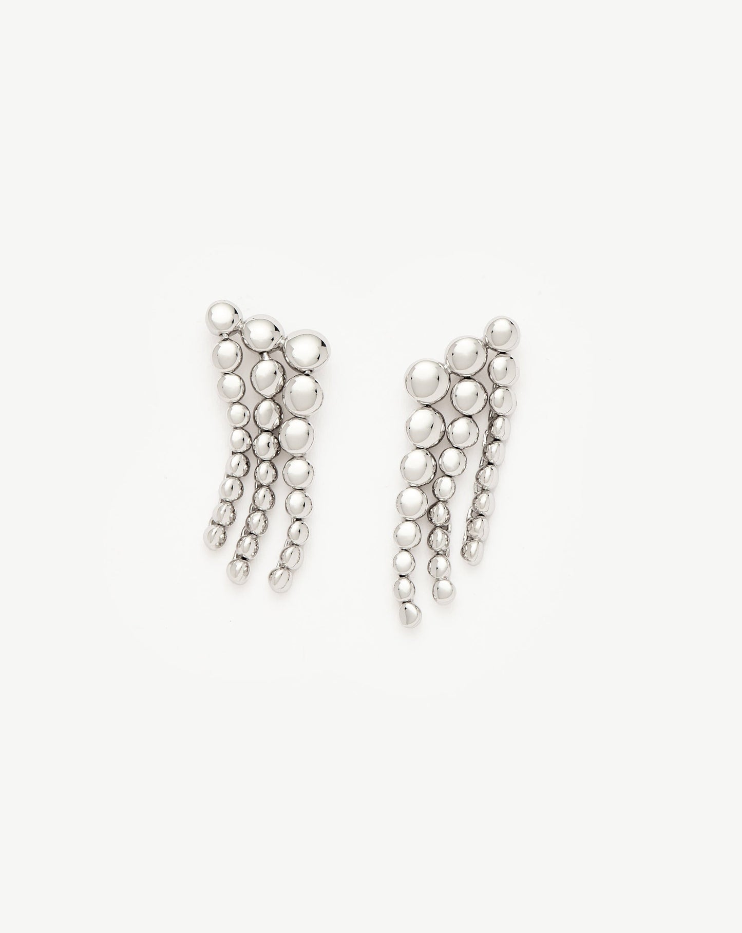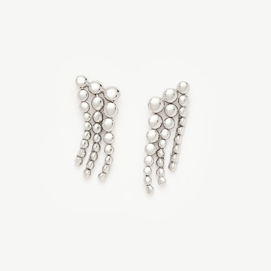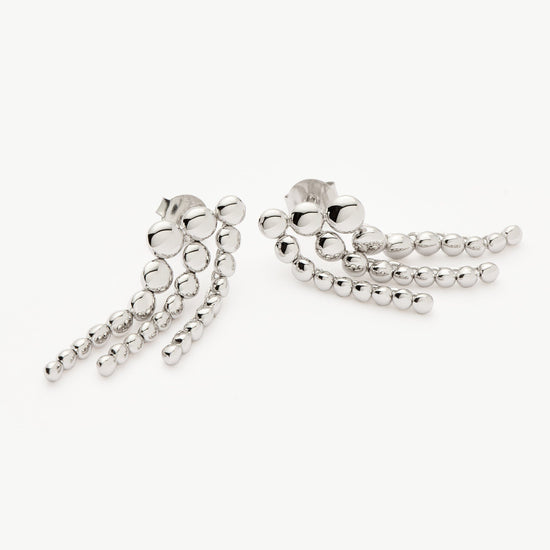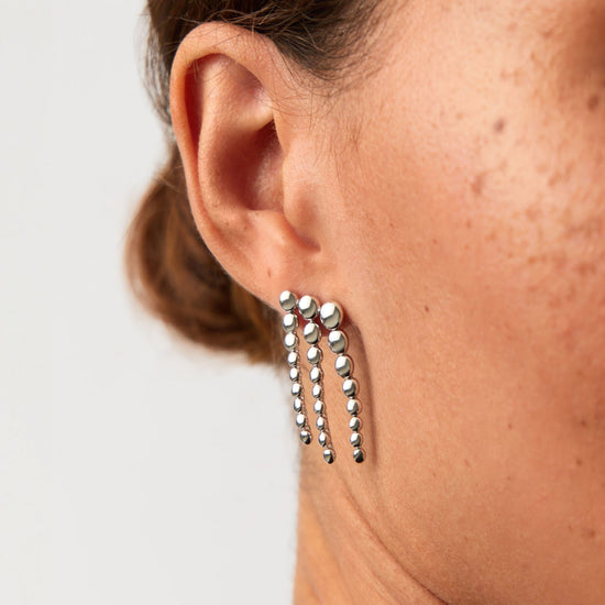 These statement silver waterfall-style silver studs feature rounded beads that graduate in size. Let them take centre stage as they move and flow in your ear stack, or team with pavé studs.
