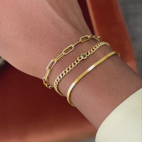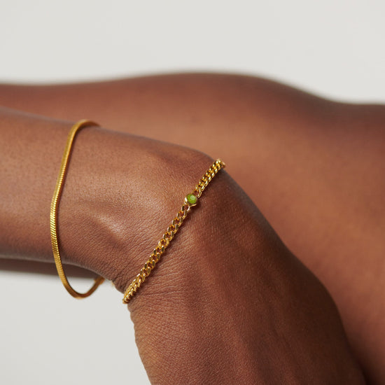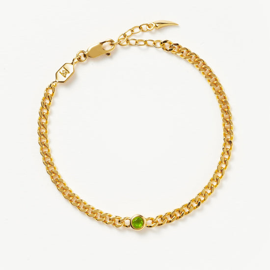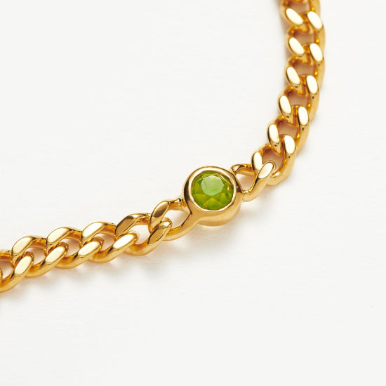 Wear your month on your sleeve with a personalized bracelet. The bezel-set natural peridot gemstone is held onto a delicate curb chain, a stone known for bringing balance. The perfect gift for anyone born in August.