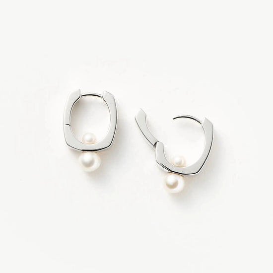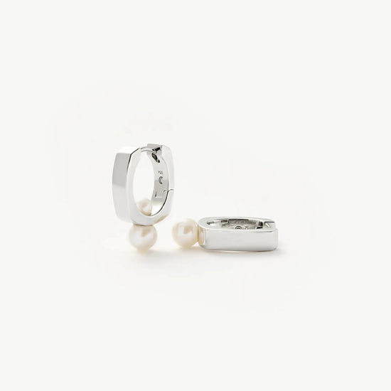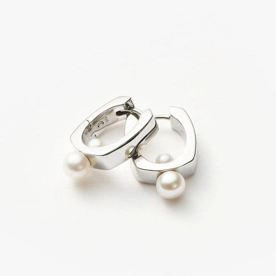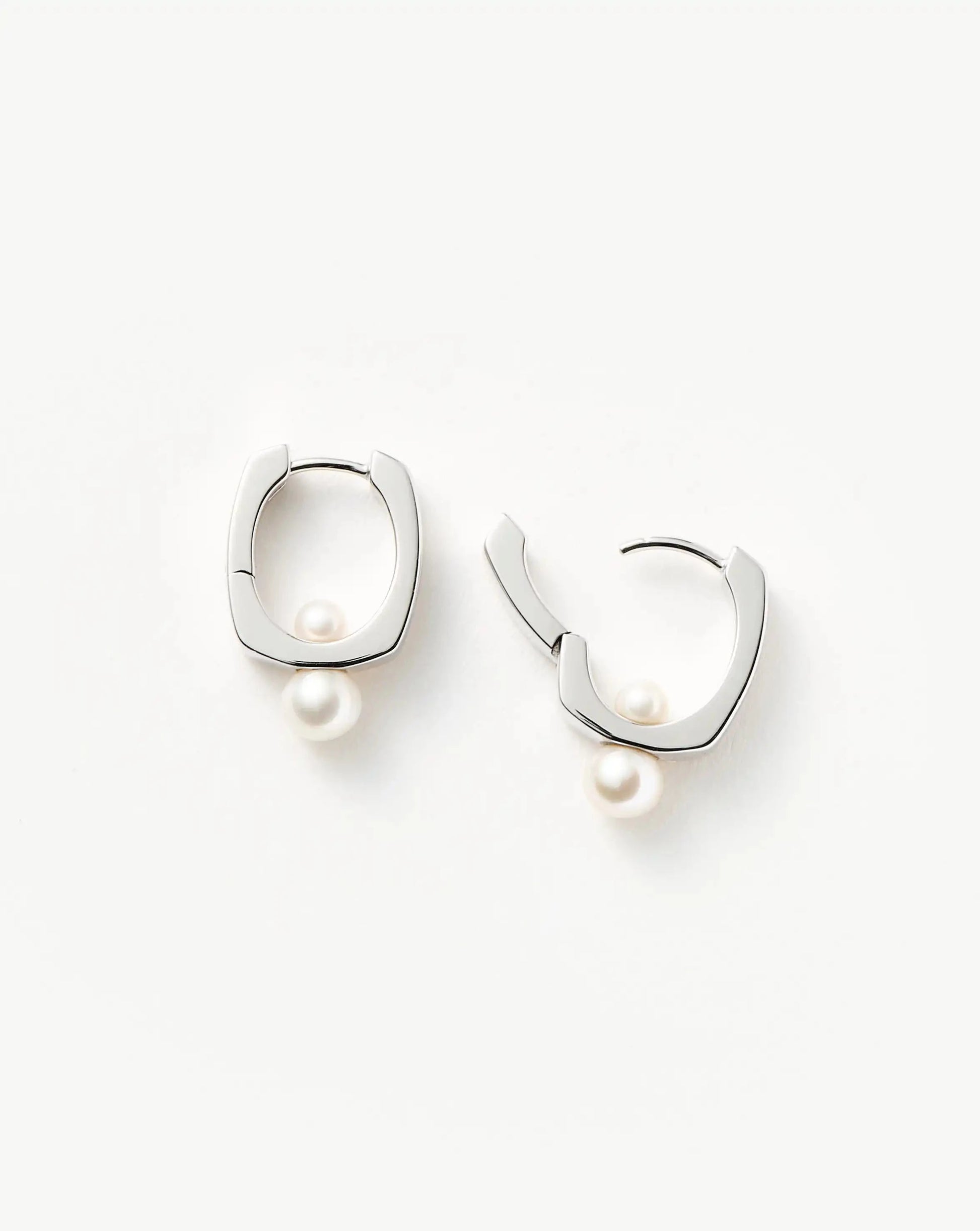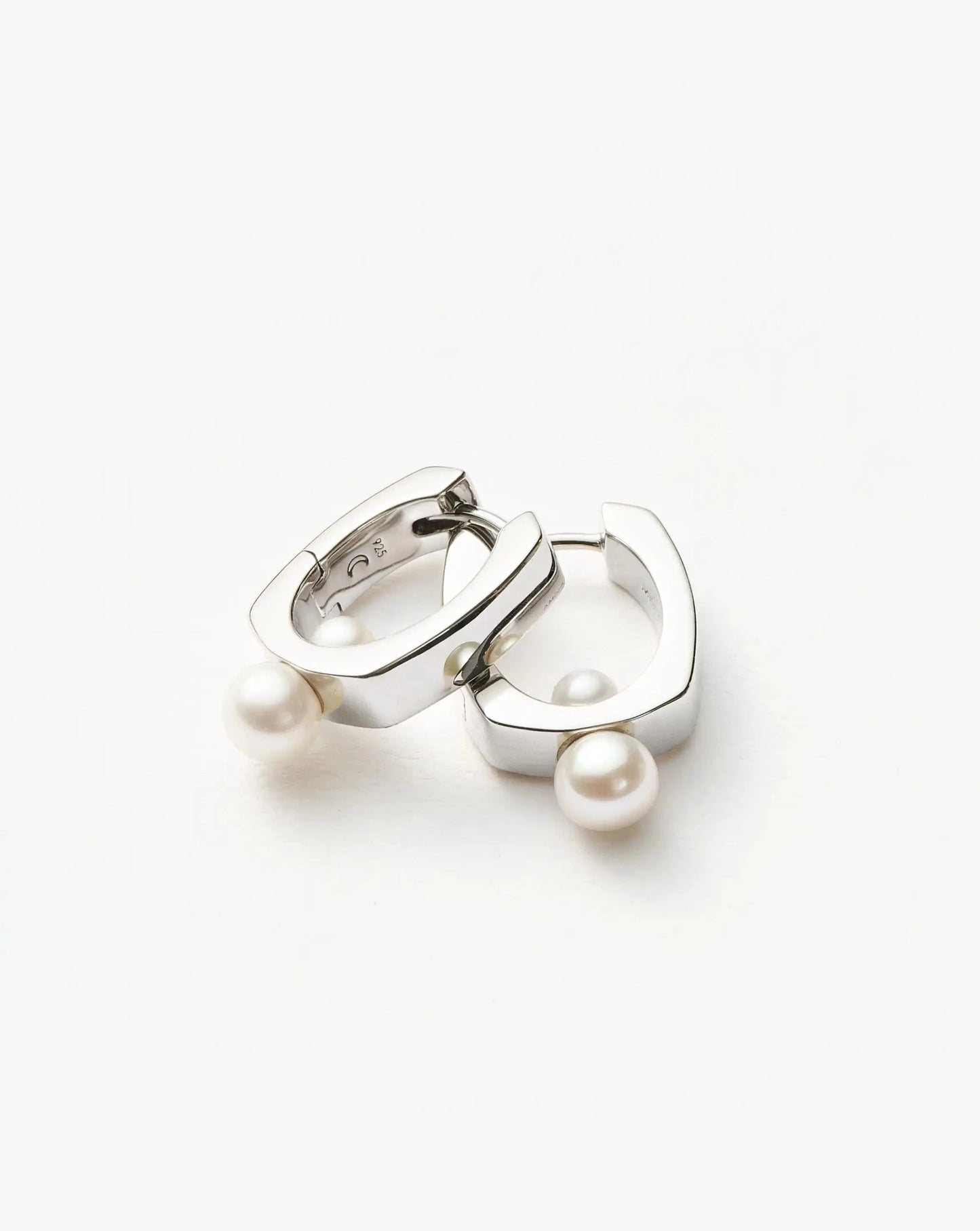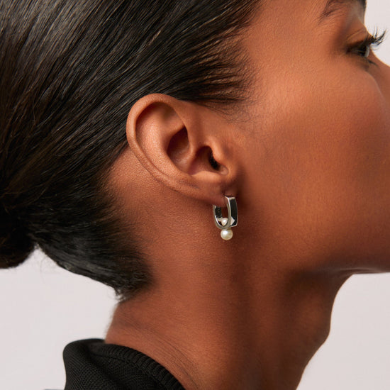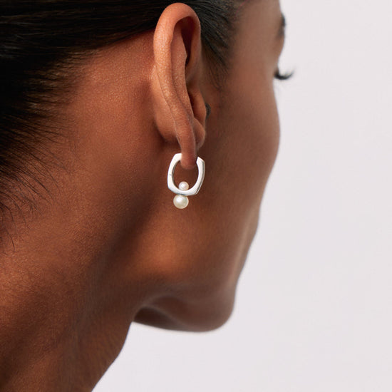 Pearls, reimagined. Everyday pearl earrings inspired by our classic ovate shape. These silver chubby huggies wrap around your ear, and feature double button pearl detailing. Wear solo or team with studs for a curated ear stack.