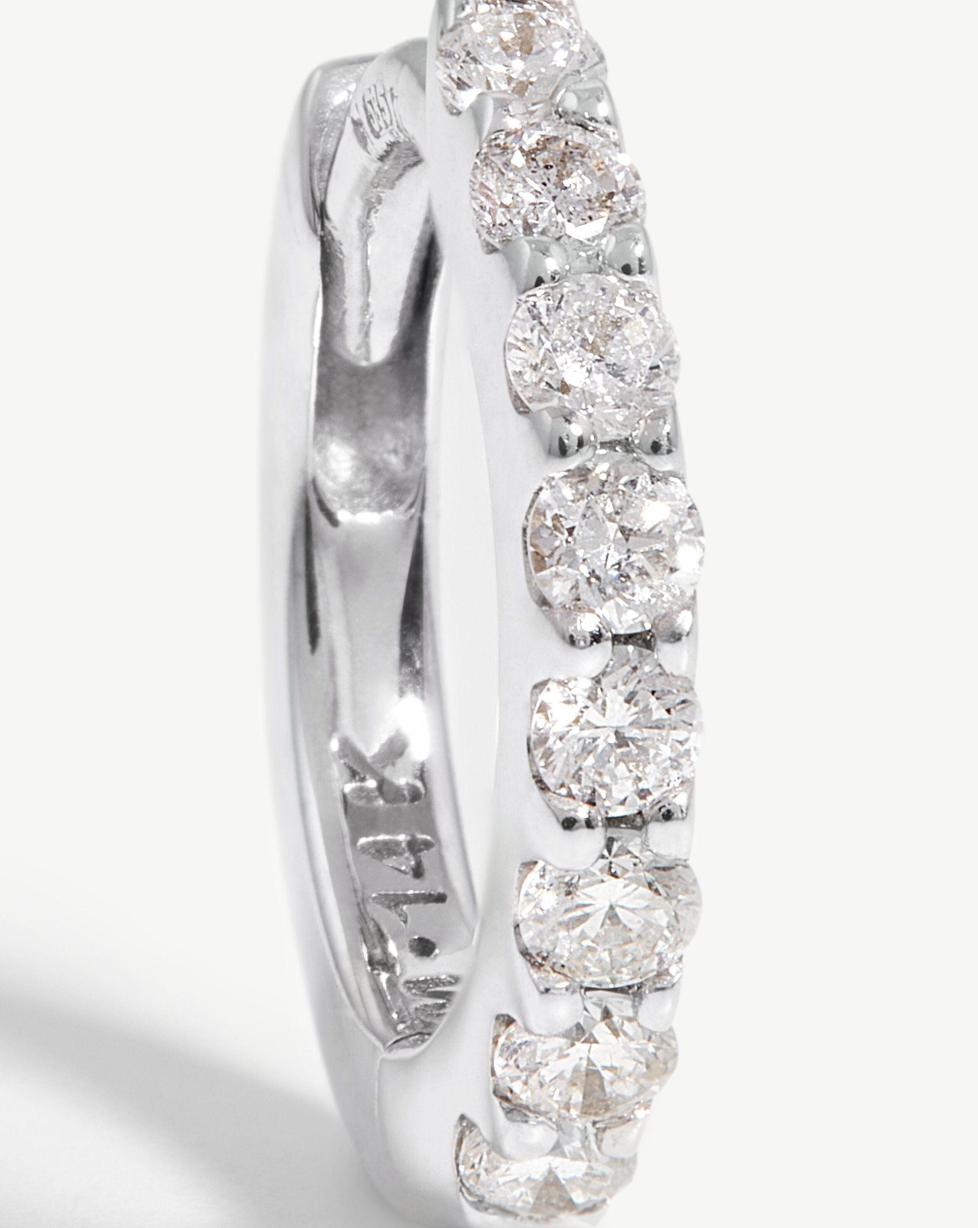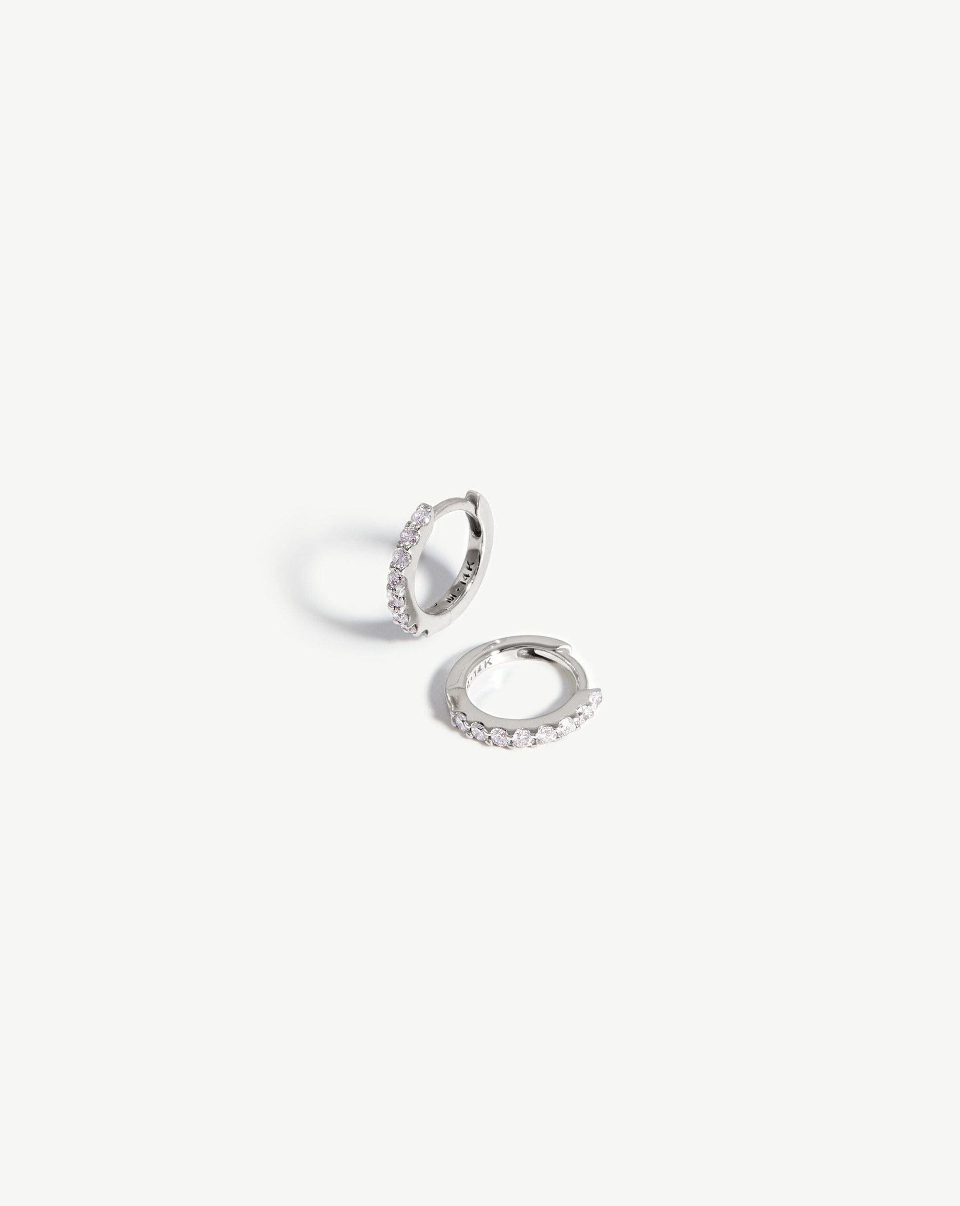 Crafted from 100% recycled 14k solid white gold, these huggies are set with round cut white diamonds and open with a hinge. The go-to piece for a second or third piercing, you'll never have to take these off. The size of this earring is best for those with smaller lobes, or perfect for second or third piercings.