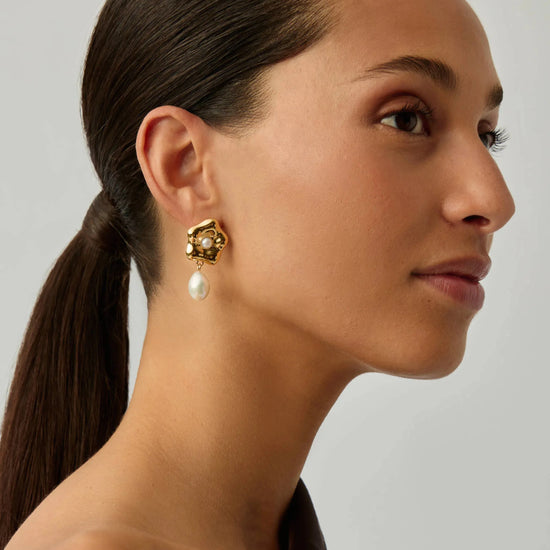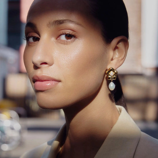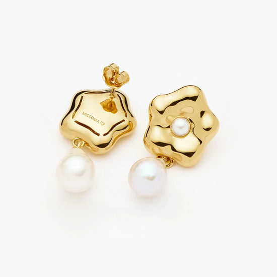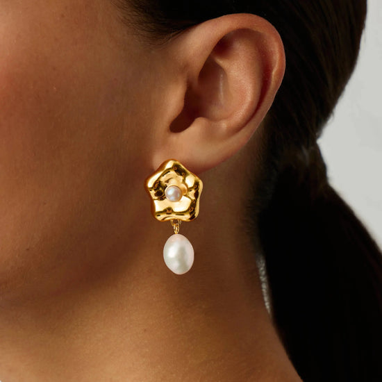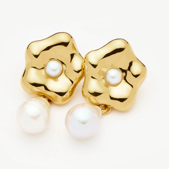Inspired by Eny Lee's signature sculptures, these statement drop earrings feature a puffy daisy stud with a central button pearl and a large drop baroque pearl. Perfect for elevating your look at any occasion.