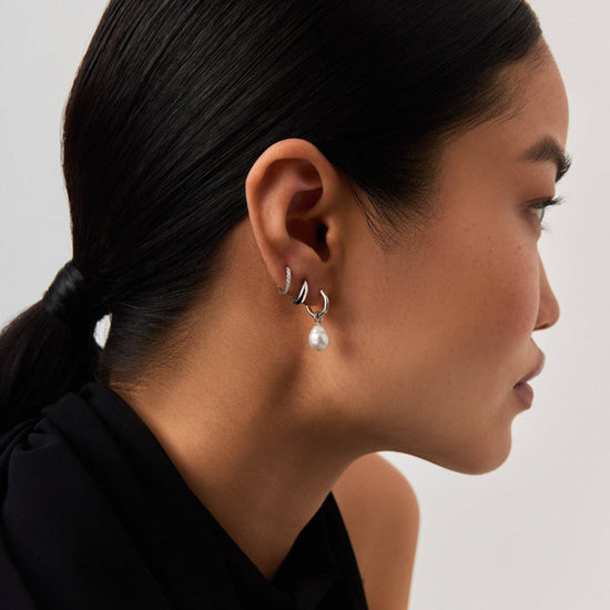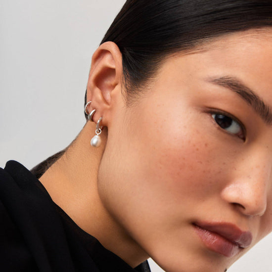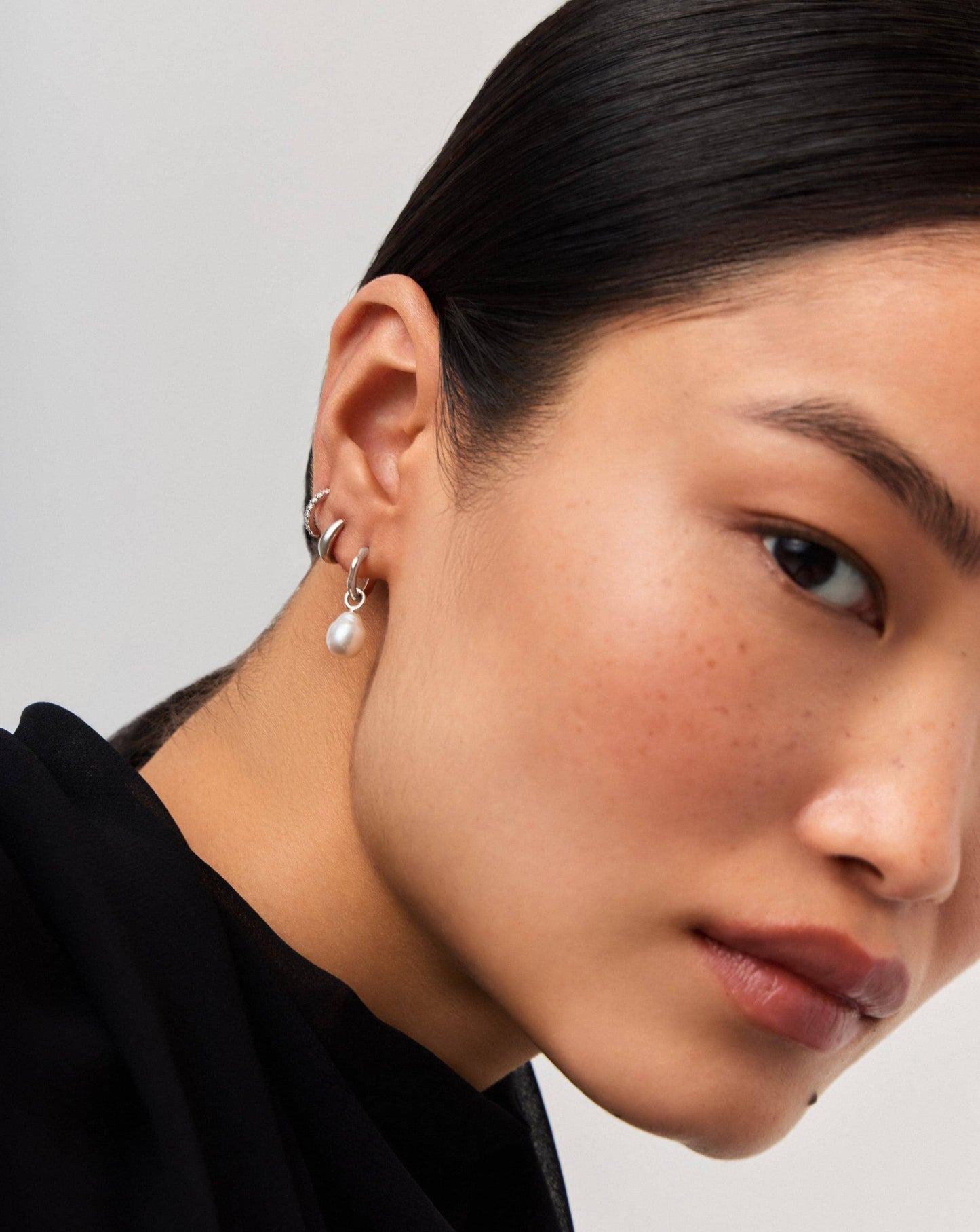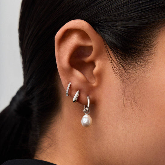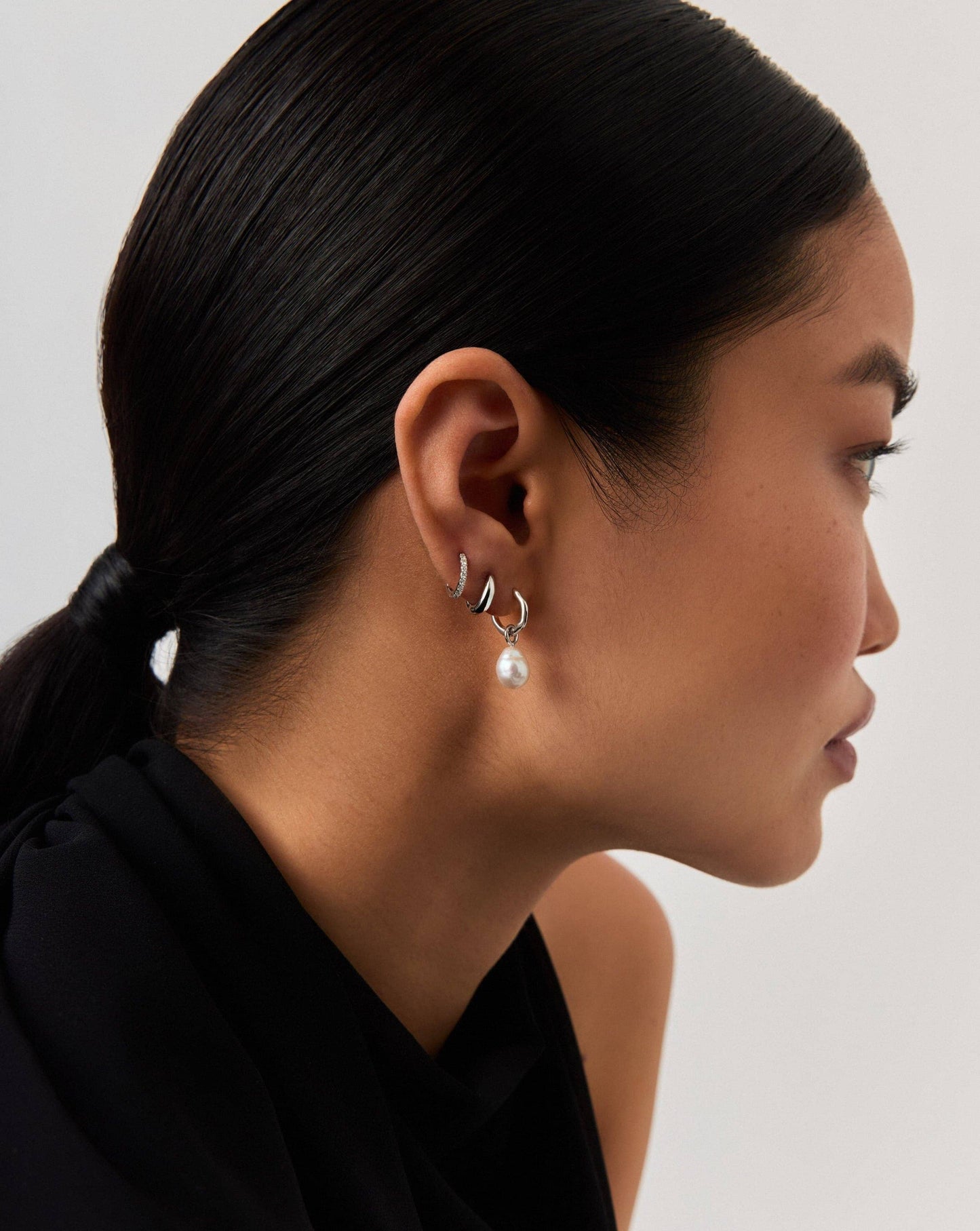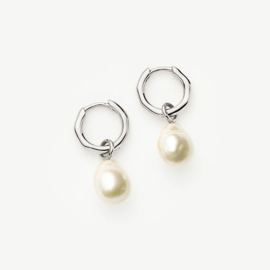 Organic baroque pearls are paired with sculptural 14k solid white gold mini hoops, featuring a hidden hinge for a seamless closure. Two earring styles in one — remove the charm to wear the mini hoops on their own.
