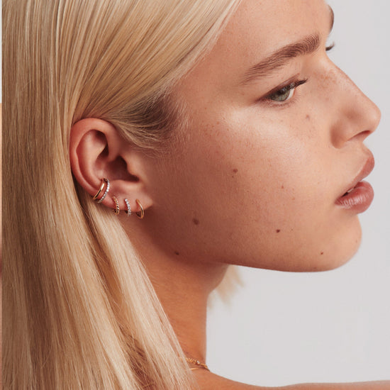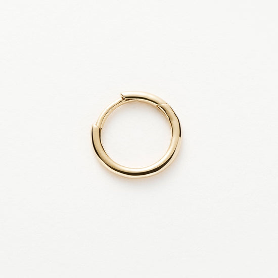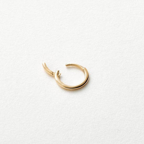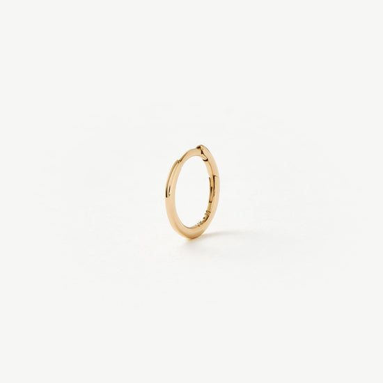An upgrade on a classic silhouette, this high-quality and timeless single small fine hoop has been upgraded to be super lightweight and feature a hidden hinge for a seamless closure. Wear solo or style with studs and mini hoops for an instant ear stack. Handcrafted from 100% certified recycled solid gold, and hallmarked for authenticity.