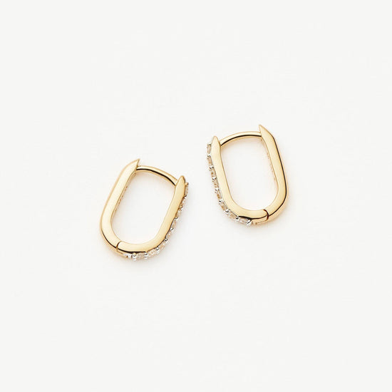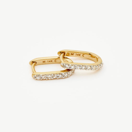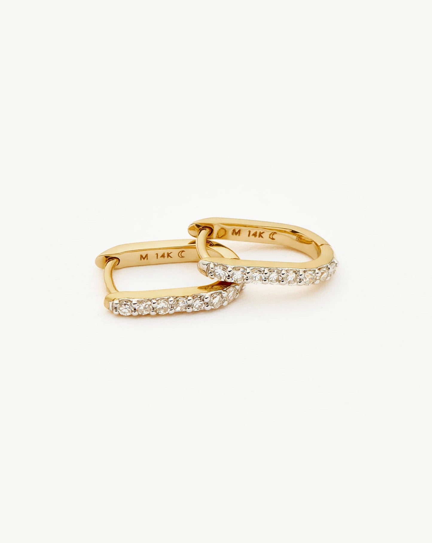 An iconic design, refined. Set with pave diamonds, these effortless mini hoops, add a subtle statement to your curated ear stack with their rectangular shape and rounded edges. Wear solo or style with studs and hoops.