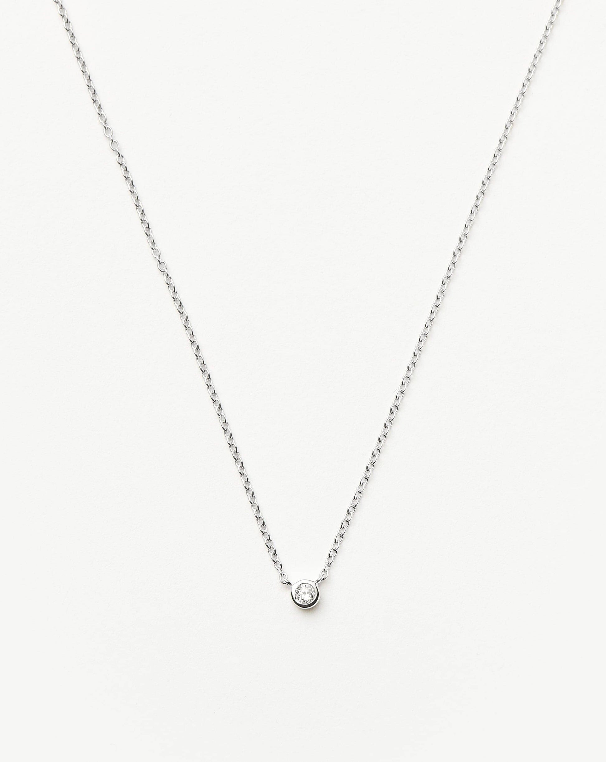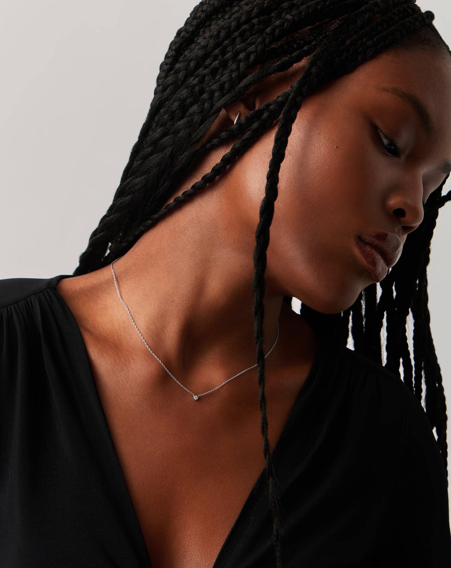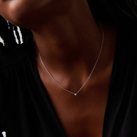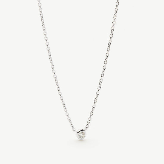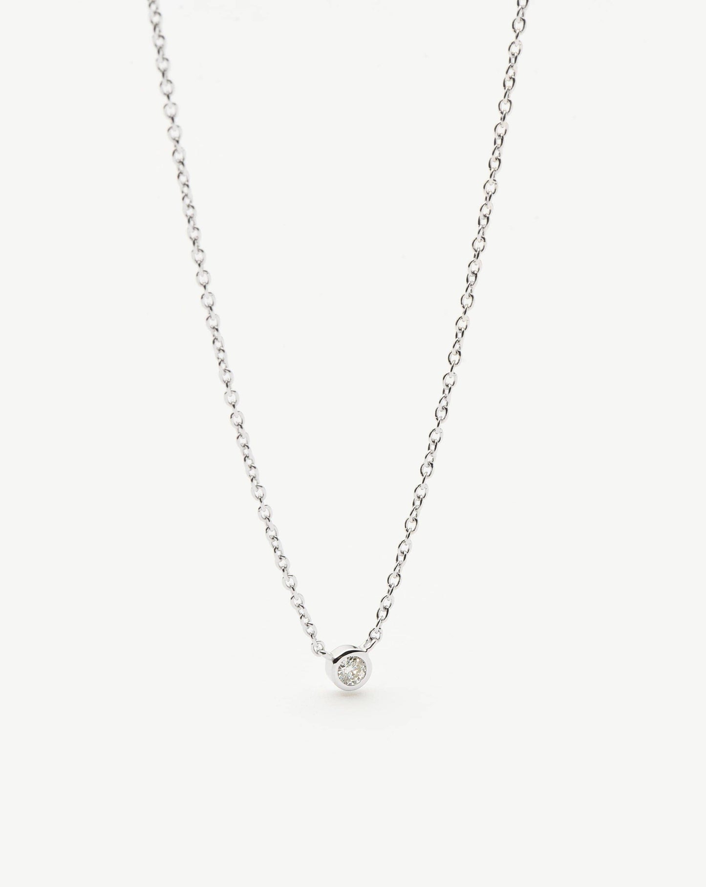 This timeless necklace features a floating solitaire diamond in a bezel setting on a classic 14k solid white gold chain. Wear solo or layer with more fine chains.
