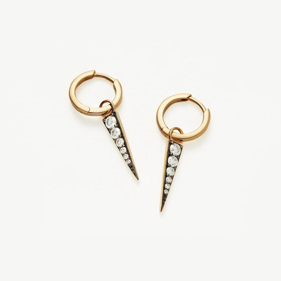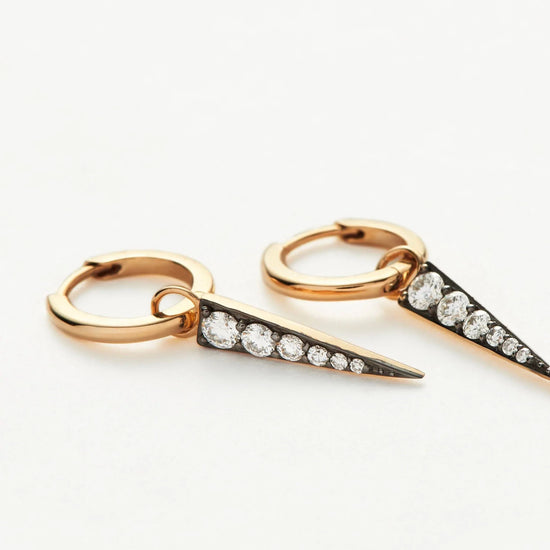 These charm hoop earrings feature diamond pavé spike charms set on black rhodium; suspended from hinged solid gold mini hoops.