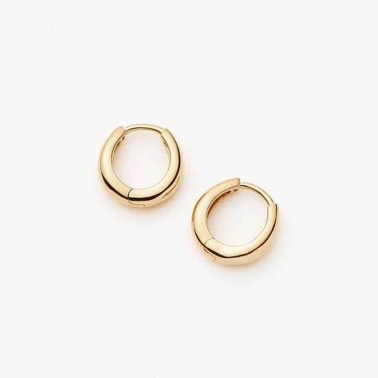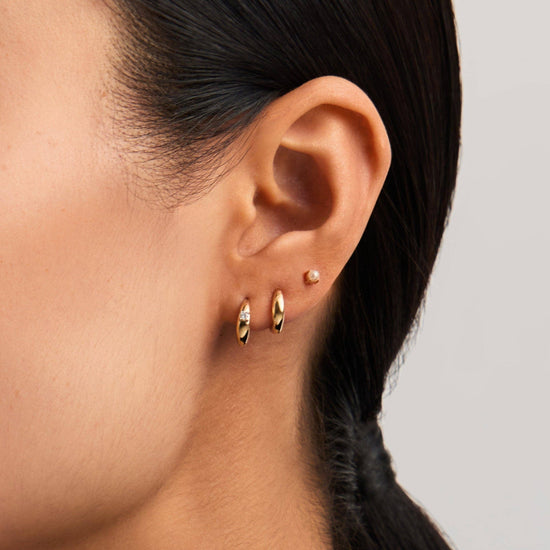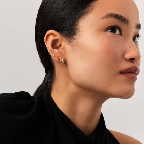 These 14k solid gold huggies hug the ear lobe with a minimalist domed design. Wear solo or style with studs and mini hoops for an instant ear stack.