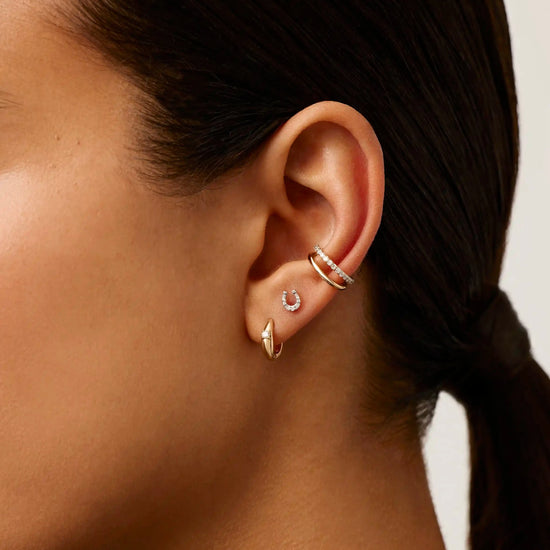 Get lucky with this single horseshoe-shaped stud earring, featuring three round white diamonds. Stack with other solid gold styles for an elevated ear stack.
