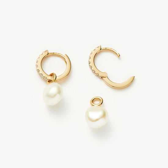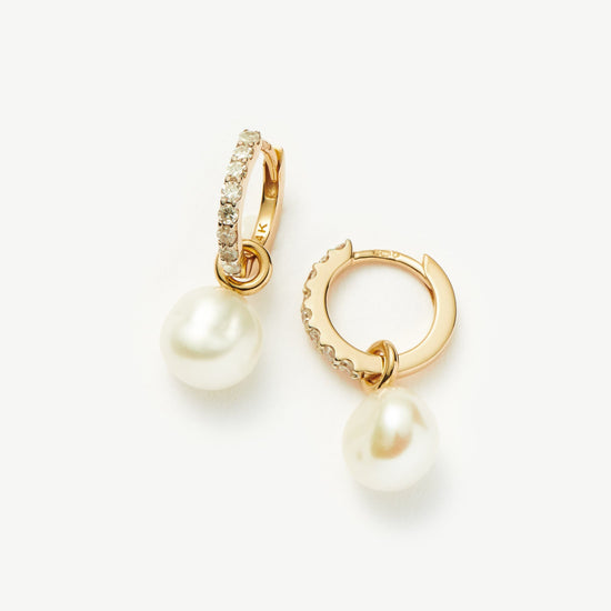 A luxury addition to your ear stack. These refined earrings feature drop baroque pearl charms suspended from mini hinged hoops, half-set with white diamond pavé. Wear solo or pair with diamond studs.