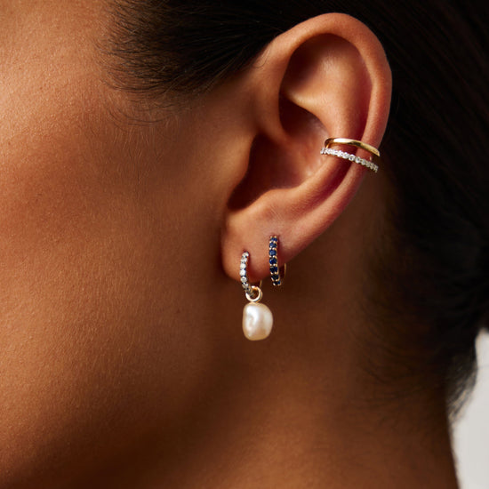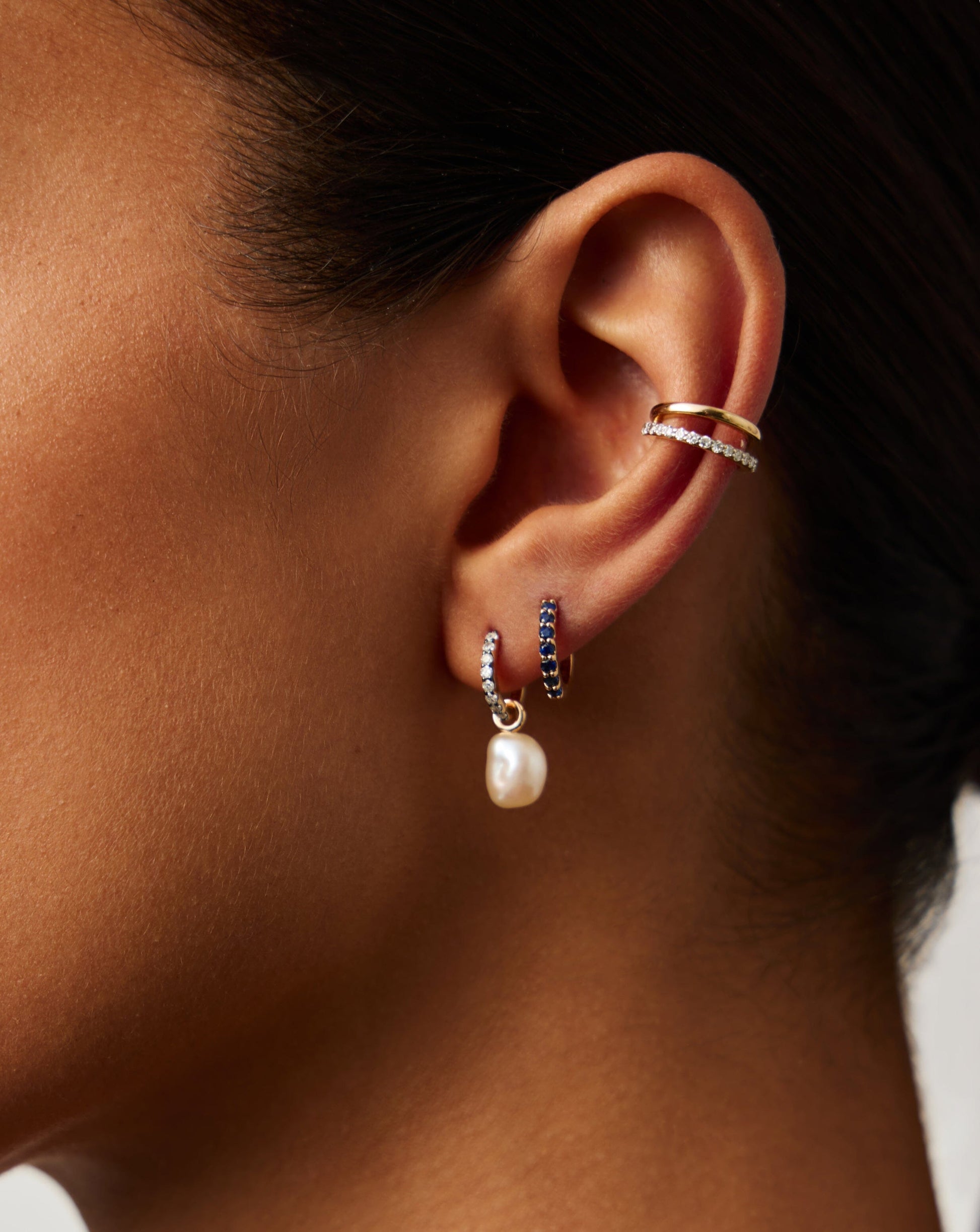 Everyday huggies, elevated. These mini hoop earrings are inset with blue sapphires and open with a hinge. Sapphire is the birthstone for September making these hoops the perfect gift. Pair with 14k solid gold huggies for a refined ear stack. Crafted from 100% recycled gold, and hallmarked for authenticity.
