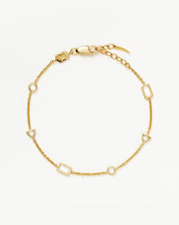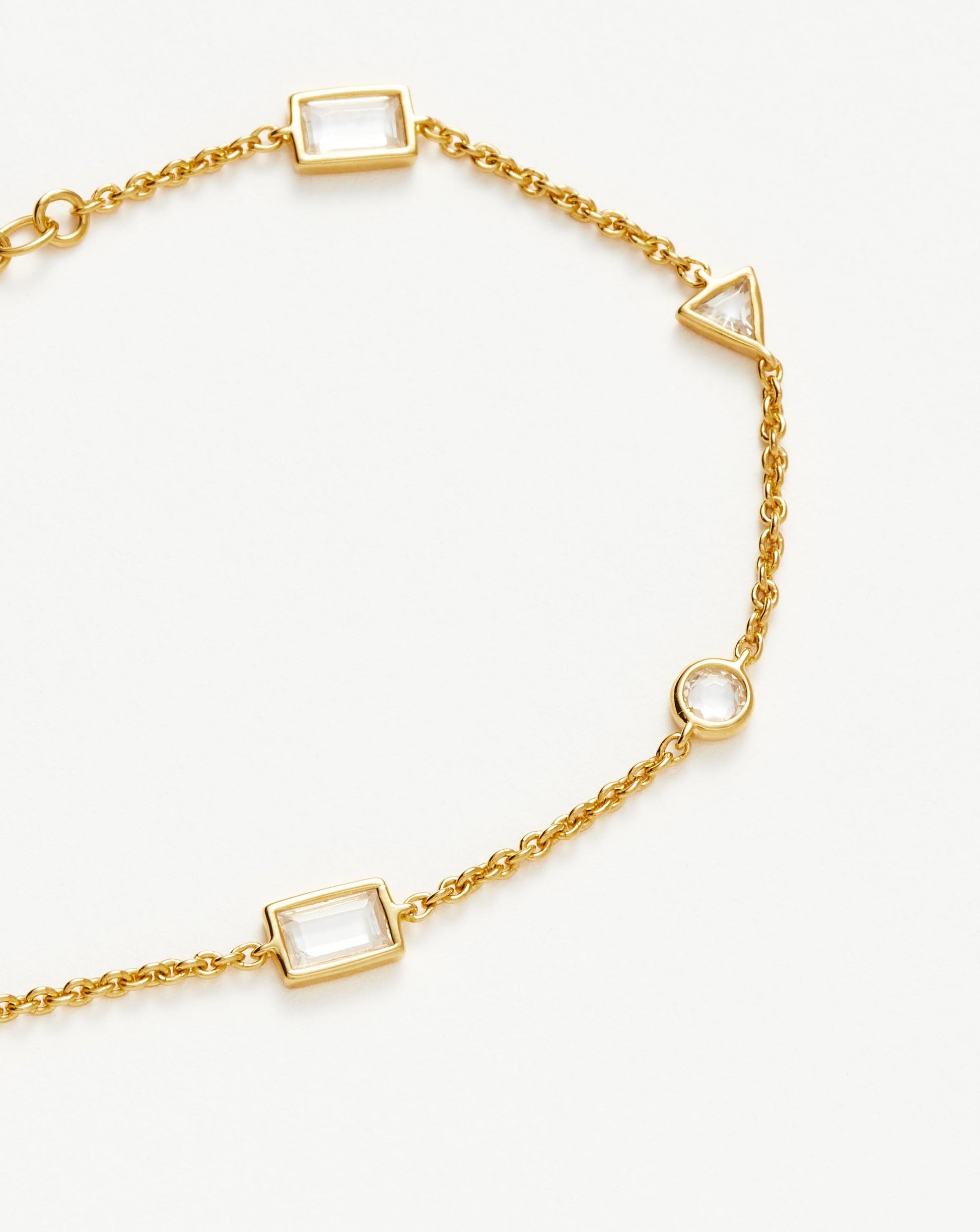 This delicate chain bracelet features a mix of baguette, round, and triangle-shaped cubic zirconia stones with gold detailing. Wear solo or create an arm stack with more chains or Enamel & Stone cuffs.