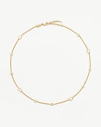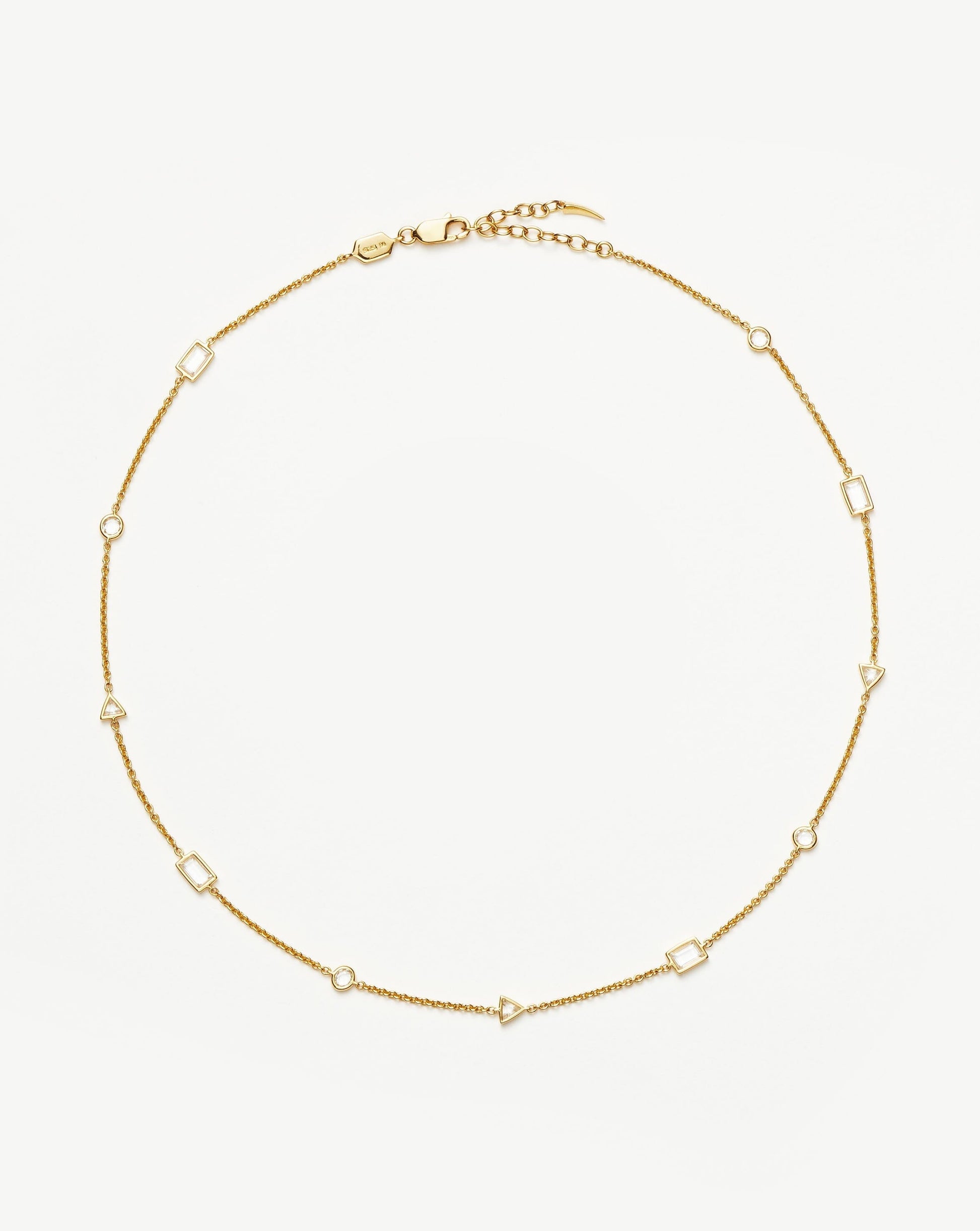 This delicate chain choker features a mix of baguette, round, and triangle-shaped cubic zirconia stones with gold detailing. Wear solo or layer with pendant necklaces, chains, or gemstones.