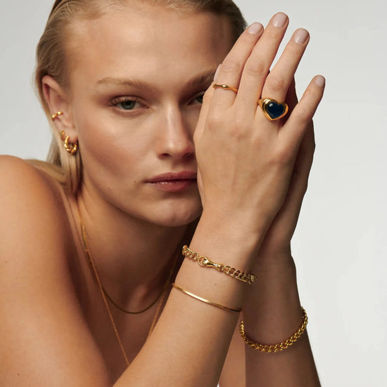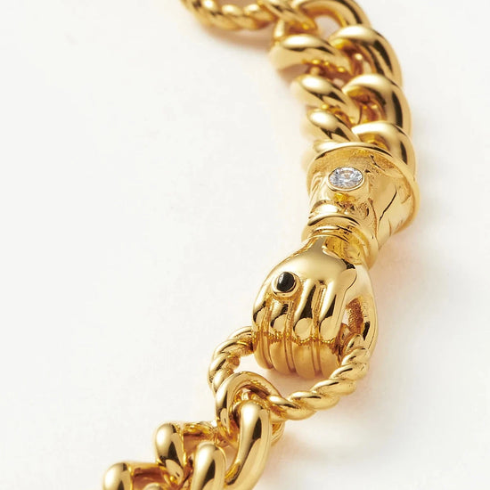 The Harris Reed x Missoma’s sell out ‘In Good Hands’ design is reimagined. This charm bracelet features the Georgian-inspired emblem on repeat, set on a chunky curb chain. Intricately detailed, each cuff has been illuminated with a white pearl cabochon and features a ring with a black onyx semi-precious stone. Stack with other chains and beaded bracelets or wear solo for everyday styling.