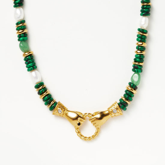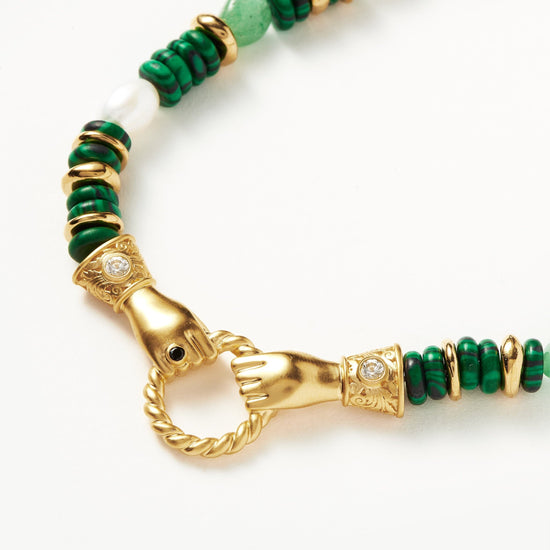 Two Georgian-inspired hands come together in the iconic pendant. Intricately detailed, each cuff has been illuminated with white topaz and features a ring with a black onyx gemstone. Wear solo or pair with the matching beaded bracelet.