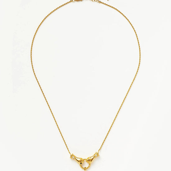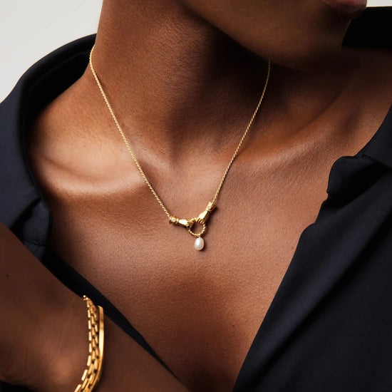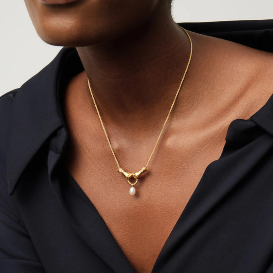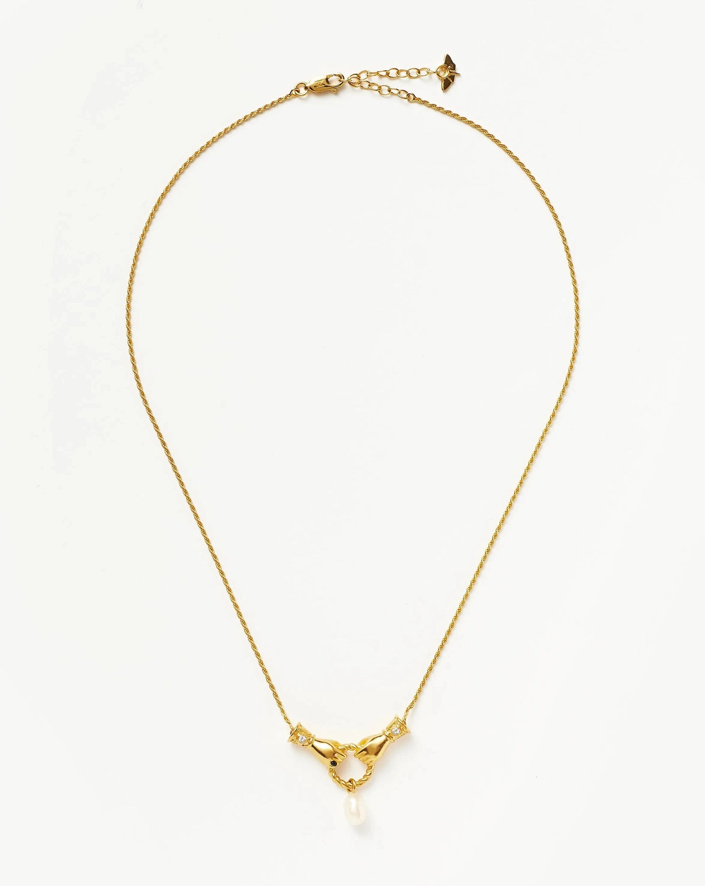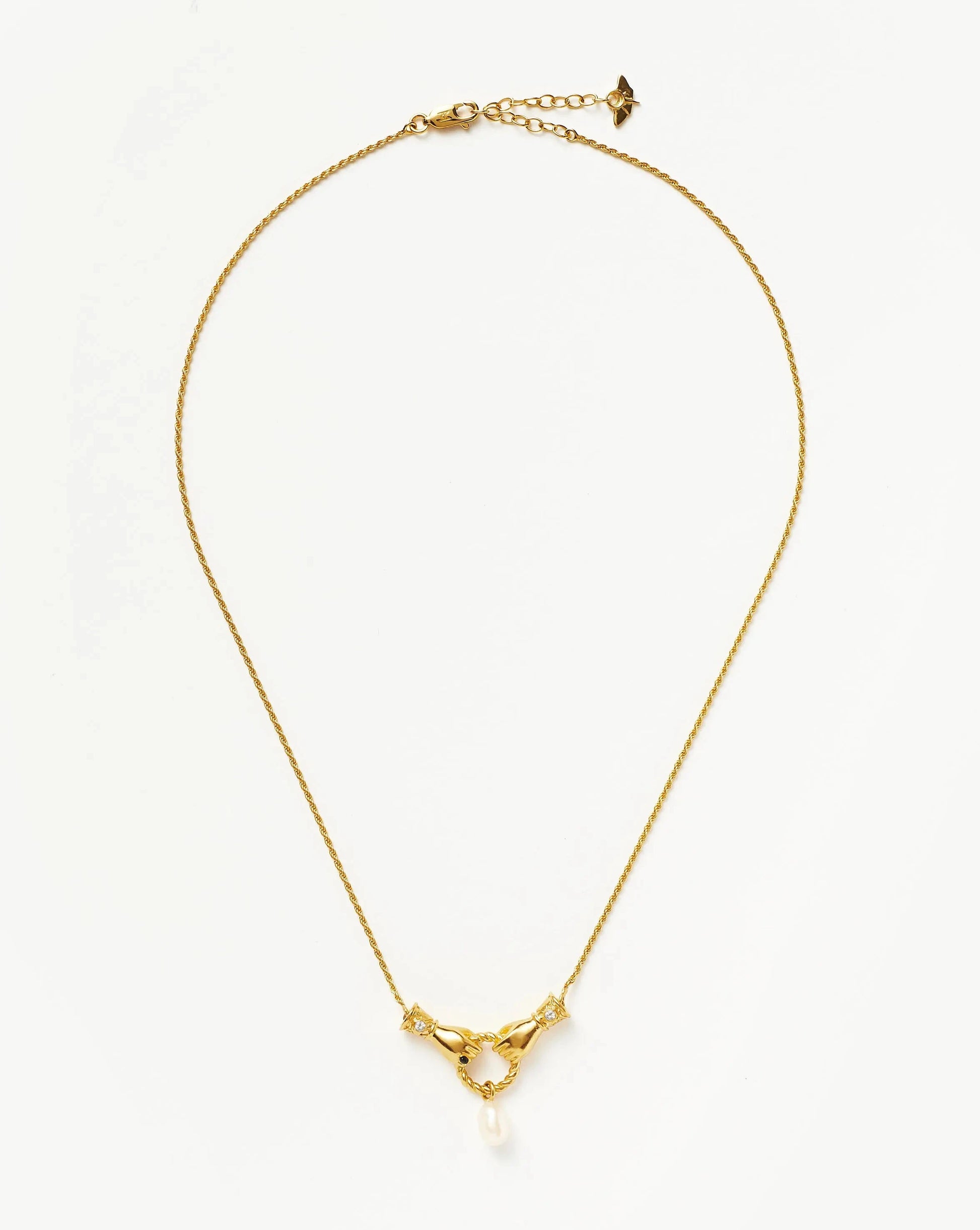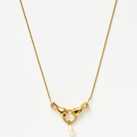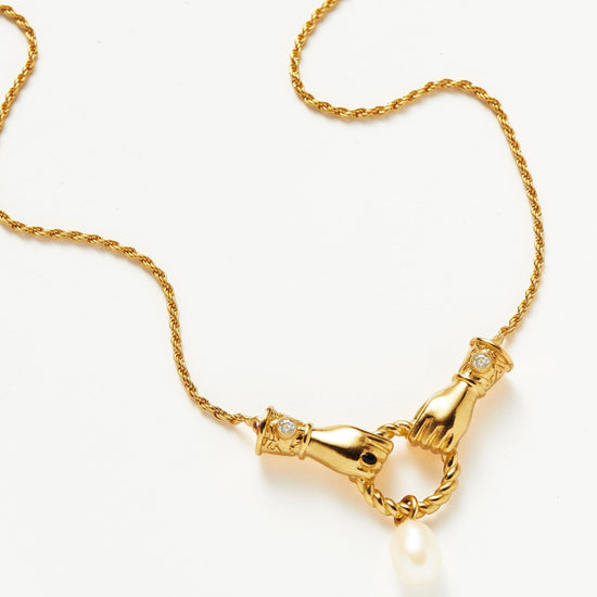 Two Georgian-inspired hands come together in this pendant, each holding a twisted ring with a single oval drop pearl. Intricately detailed, each cuff has been illuminated with white pearl cabochons and features a ring with a black onyx gemstone. The rope chain is finished with the collection's bespoke butterfly end charm, a symbol of duality.