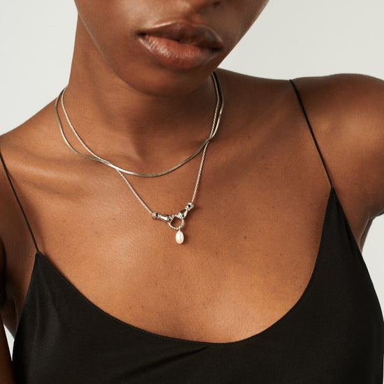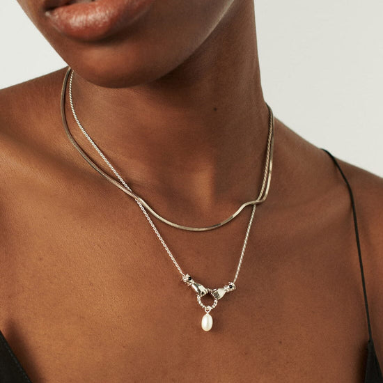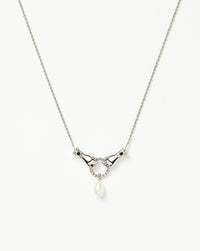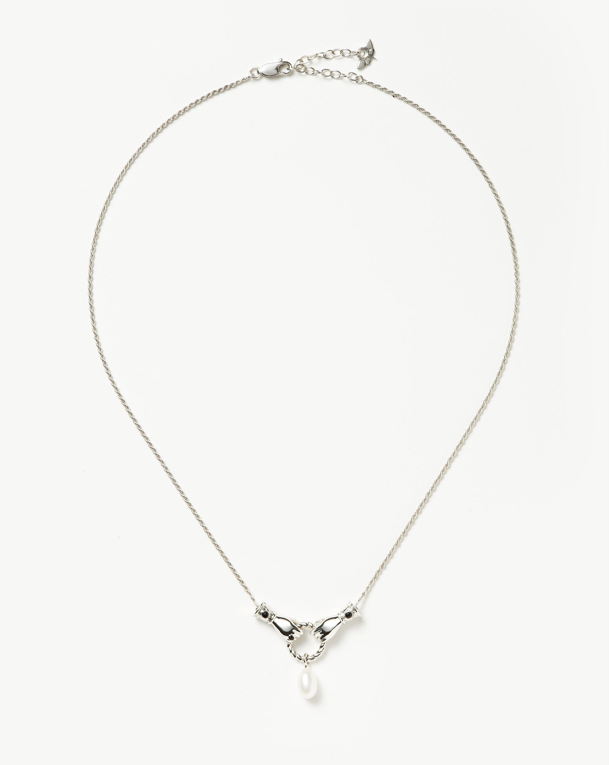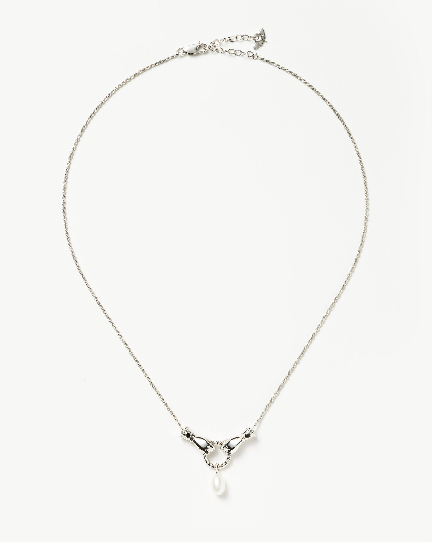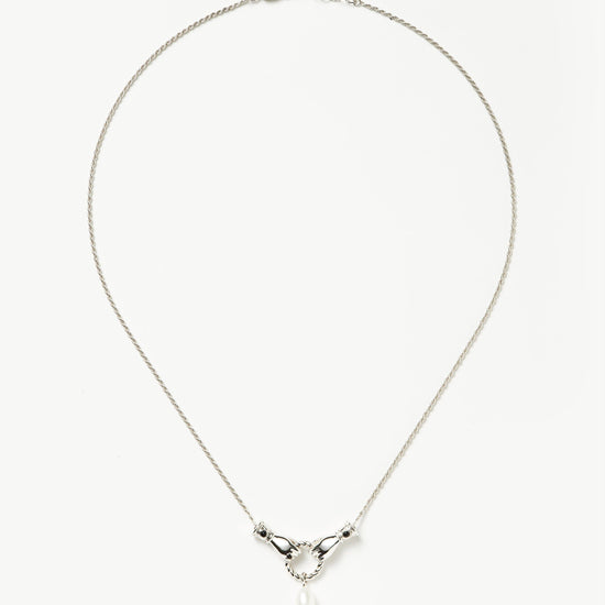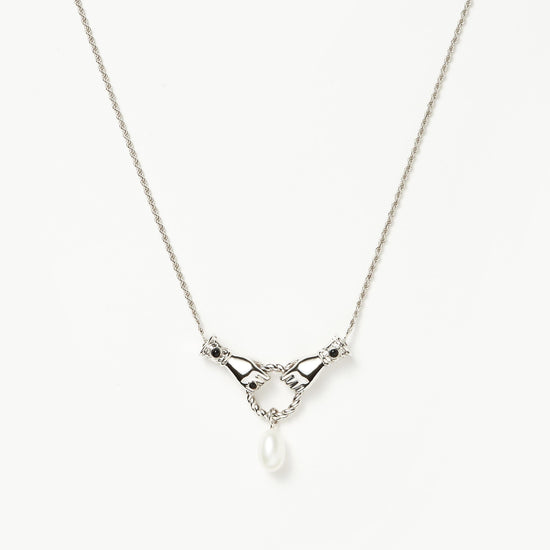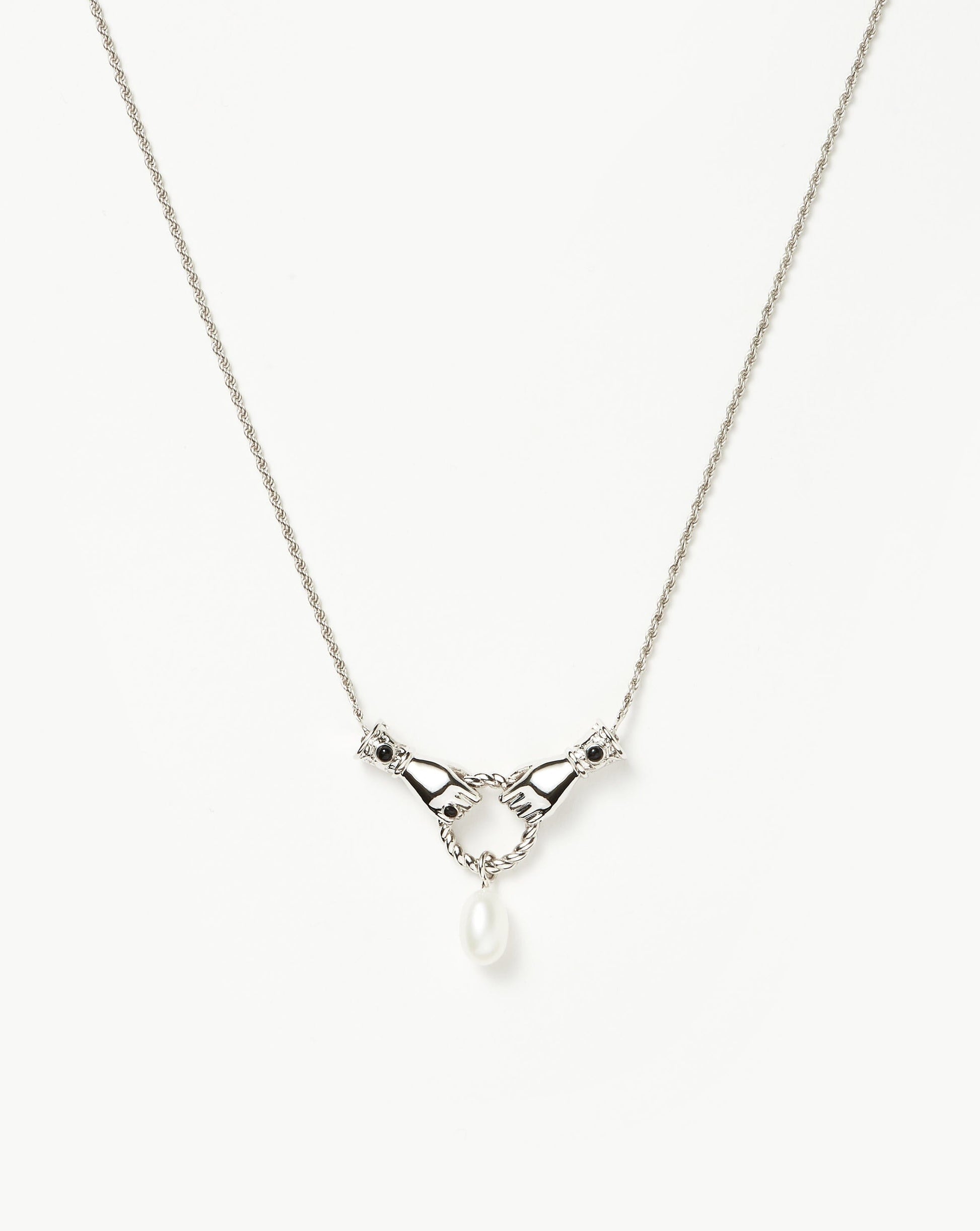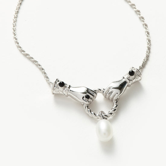 Two Georgian-inspired hands come together in this pendant, each holding a twisted ring with a single oval drop pearl. Intricately detailed, each cuff has been illuminated with white pearl cabochons and features a ring with a black onyx gemstone. The rope chain is finished with the collection's bespoke butterfly end charm, a symbol of duality.