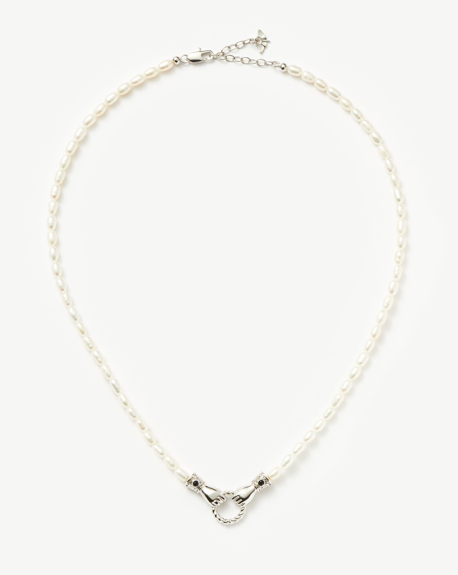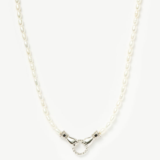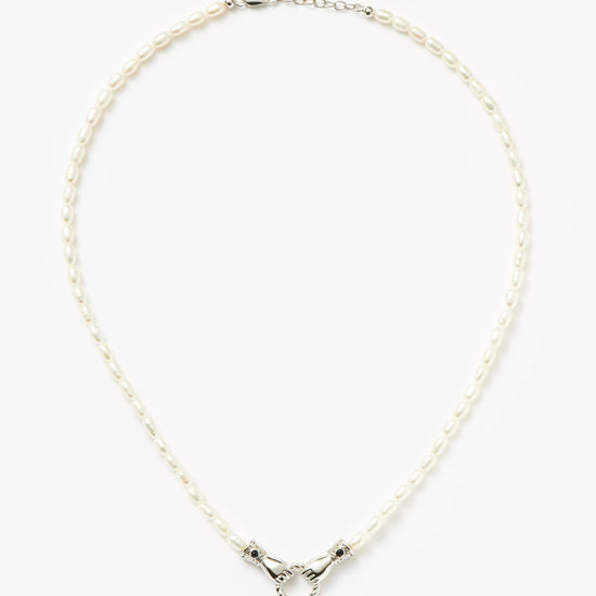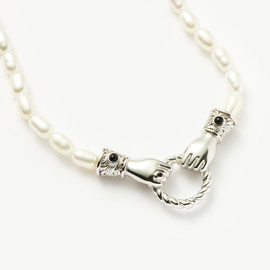 Two Georgian-inspired hands come together in this pendant, each holding a twisted ring. Intricately detailed, each cuff has been illuminated with white pearl cabochons and features a ring with a black onyx gemstone. The seed pearl necklace is finished with the collection's bespoke butterfly end charm, a symbol of duality. Pair with the In Good Hands Pearl Bracelet.