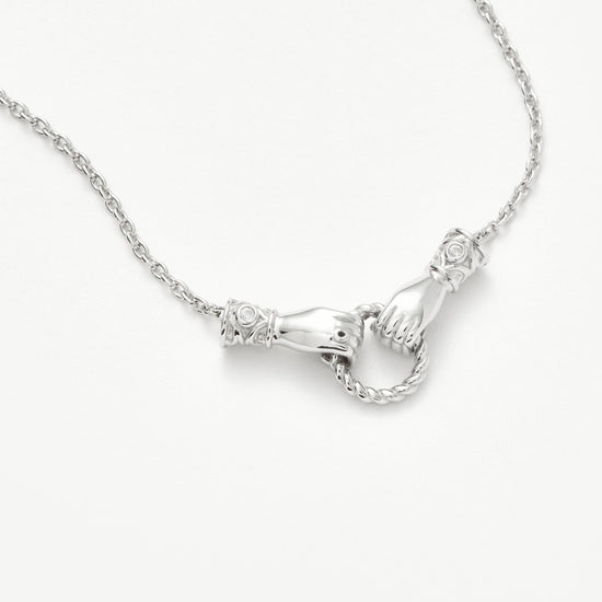Two Georgian-inspired hands come together in the iconic pendant. Intricately detailed, each cuff has been illuminated with white cubic zirconia and features a ring with a black enamel. Wear solo for a more minimalist look or stack with beaded styles for a pop of color.