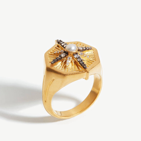 This octagonal signet ring features a central pearl cabochon, graduating white cubic zirconia pavé on black rhodium surrounded by ridged detailing. Wear this statement ring solo or create your own stack with other rings.