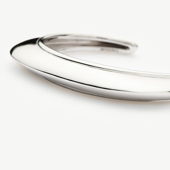 This cuff bracelet features high shine detailing and a pyramid profile. Available in small, medium and large. Style solo or pair with a Hera Dome Statement Cuff Bracelet in gold for a mixed metals arm stack.