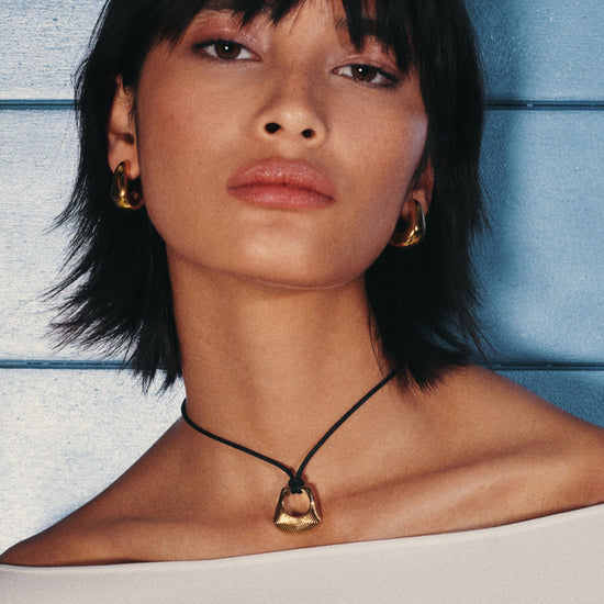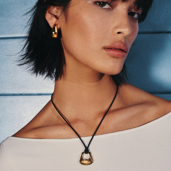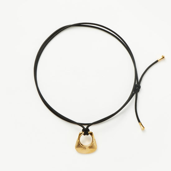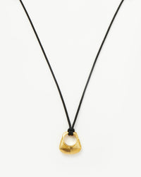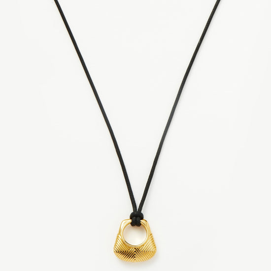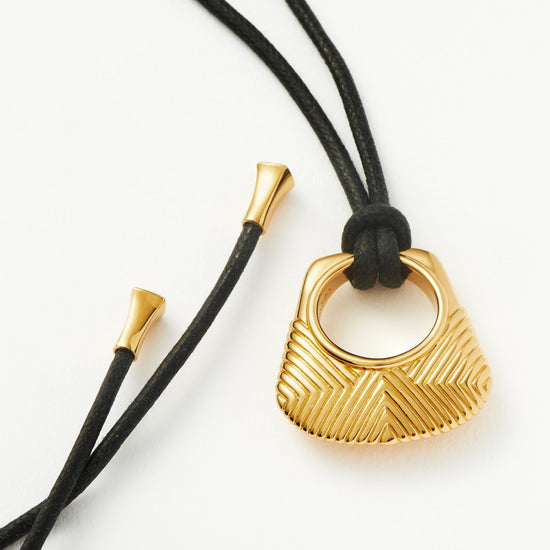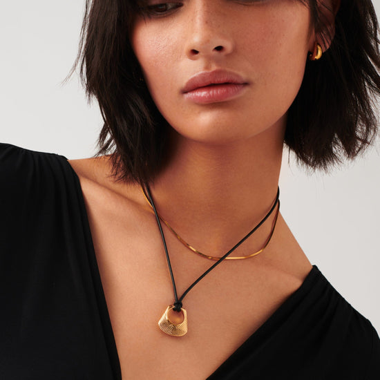 A capsule of sculptural modern-day amulets. This statement gold pendant cord necklace features geometric ridge detailing and a pyramid profile. Textures and geometric patterns combine to signify intuition, inner knowing, and creativity. The cord can be tied at any length, doubled up as a choker, or worn long — your new everyday staple