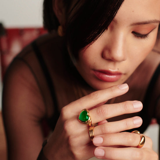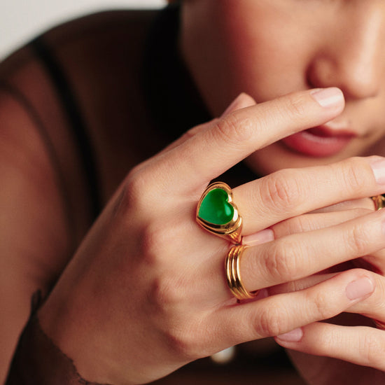 The chubby jelly heart gemstone ring is set with a dyed green chalcedony cabochon stone surrounded by signature ridge detailing on a domed band. Wear solo or stack with other chunky pieces.