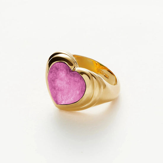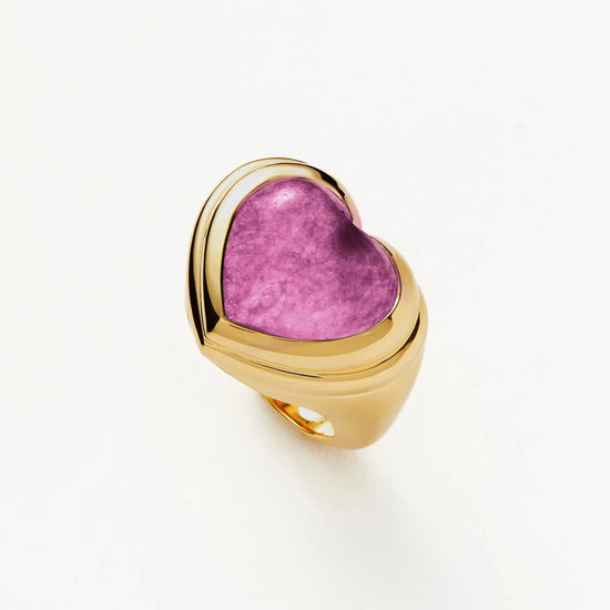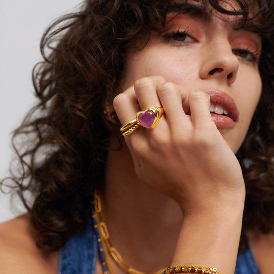 Share the love. The chubby jelly heart gemstone ring is set with a dyed purple quartz cabochon stone – known for bringing purity stone – surrounded by signature ridge detailing on a domed band. Wear solo or stack with other chunky pieces.