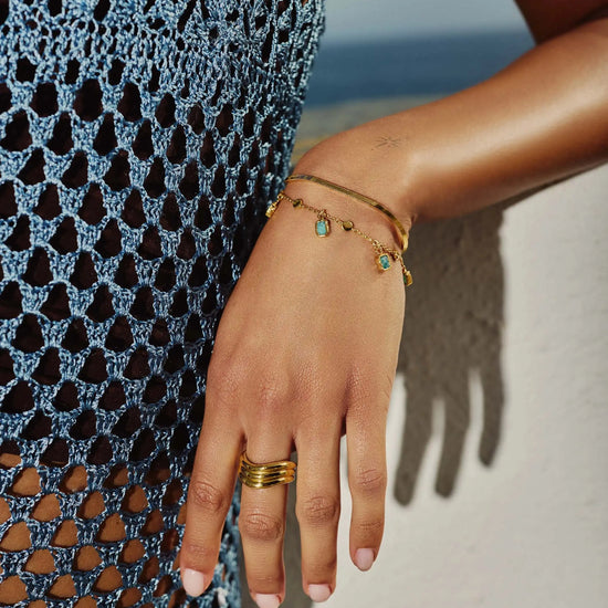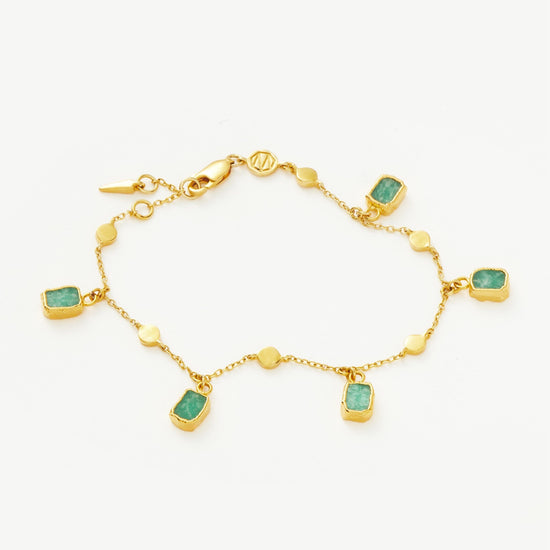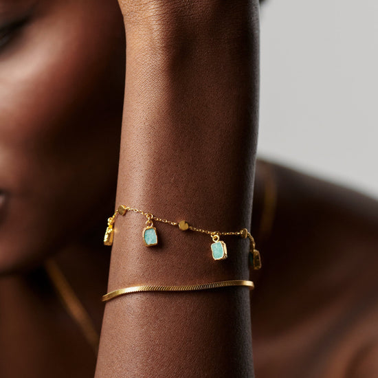 A best selling design to elevate your arm stack. Evenly spaced amazonite gemstones – known for healing – bring color to this impactful bracelet, paired with a delicate bobble chain. Stack with chunkier chains or wear solo for everyday styling.