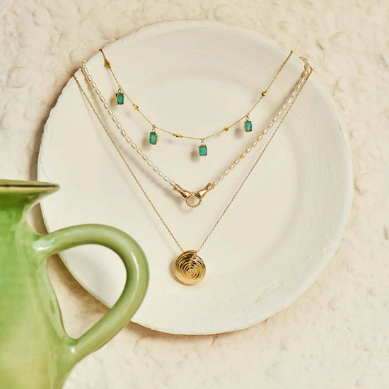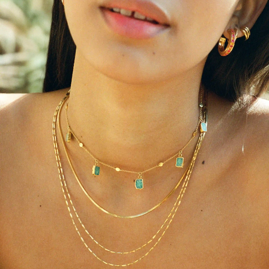 Our best selling Lena Charm Choker necklace features evenly spaced amazonite gemstones – known for healing – sitting on a delicate 18k Gold Plated bobble chain. Layer with chain necklaces or pair with the lena charm necklace.
