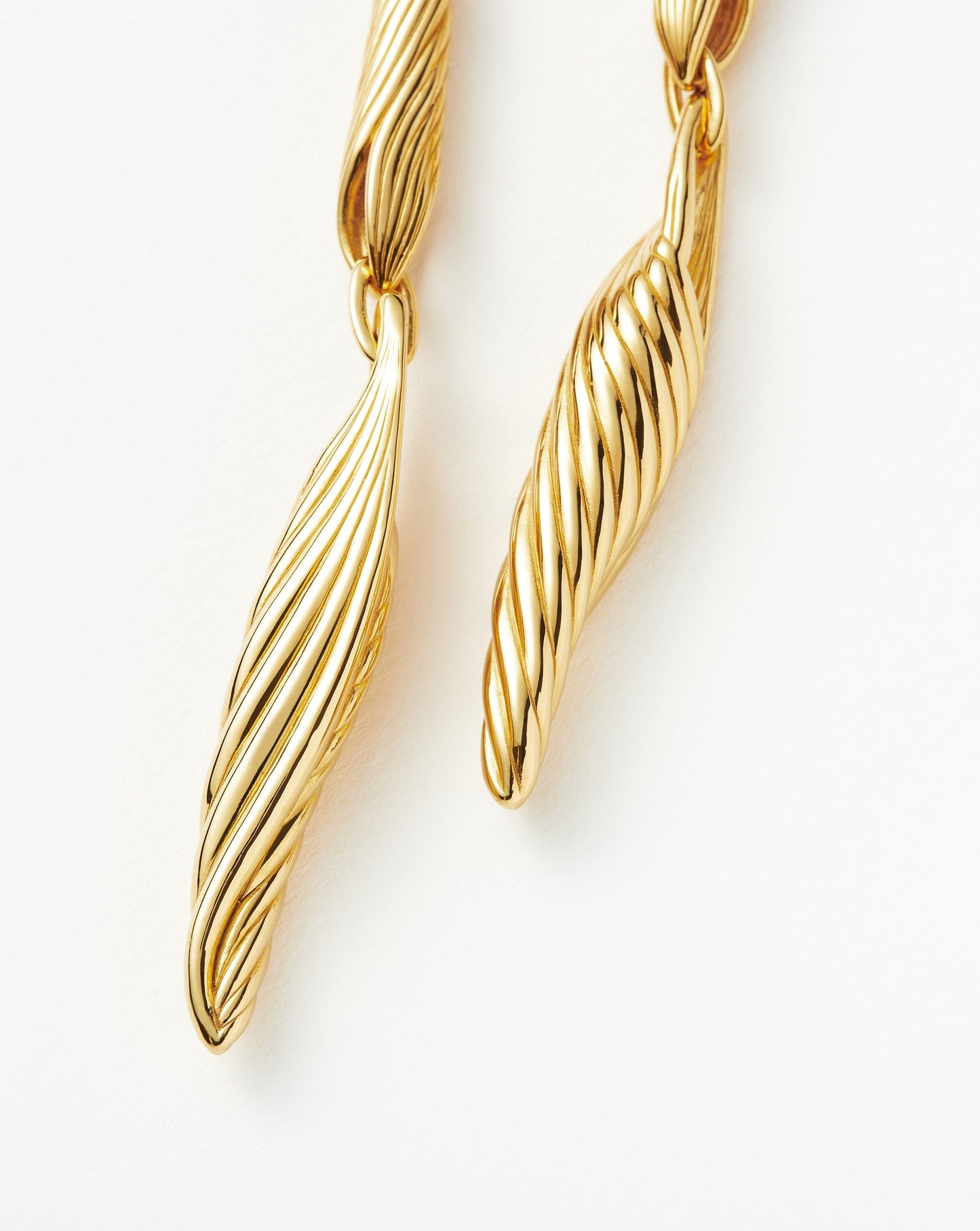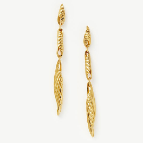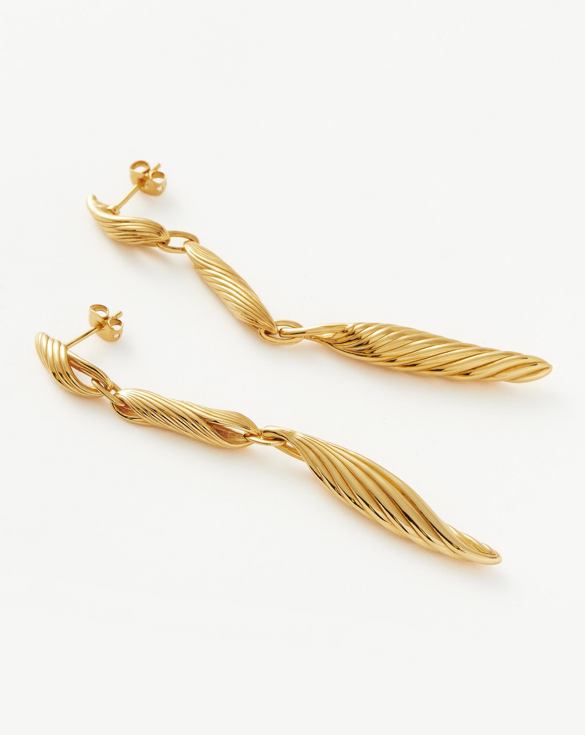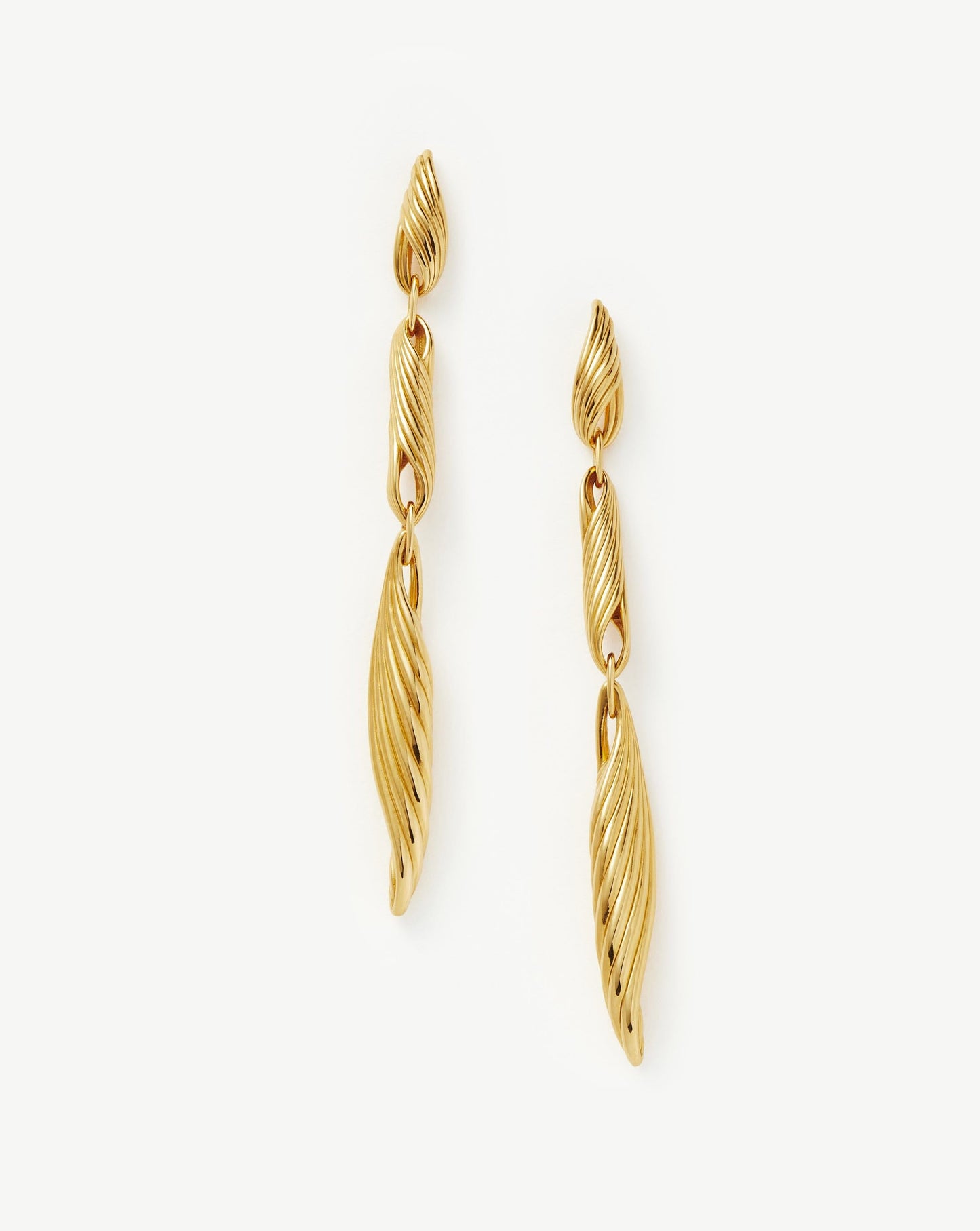 These triple drop earrings feature twisted ridge detailing, inspired by the ripples of the ocean, and a tapered design. Let this statement pair dangle solo or style with mini hoops and studs for an instant ear stack.