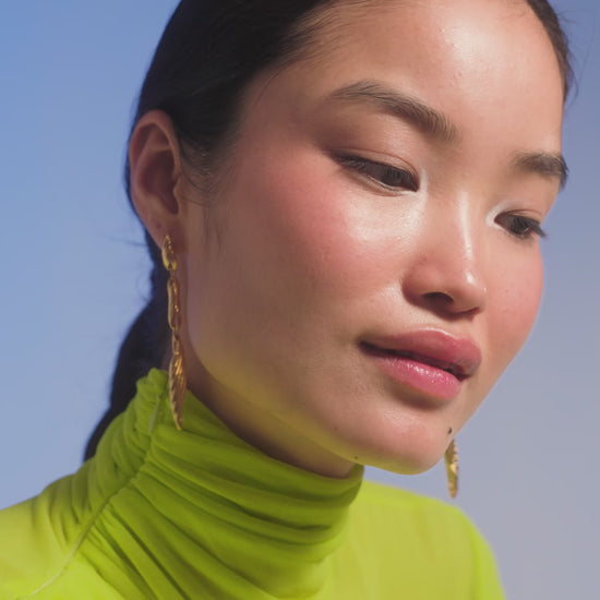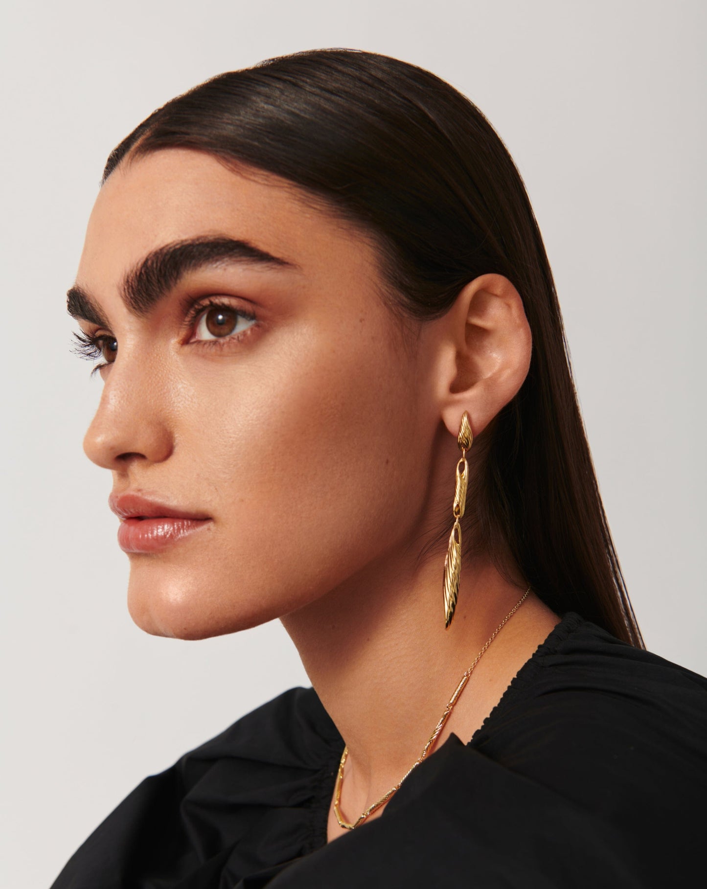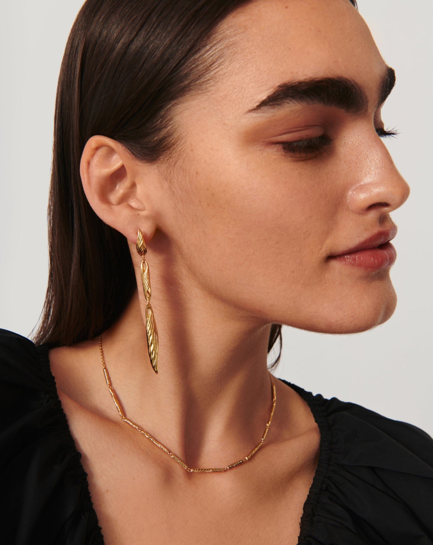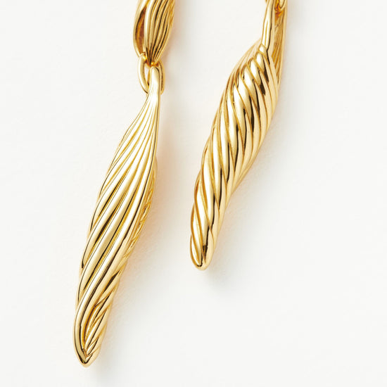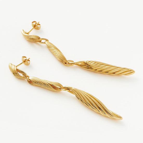 These triple drop earrings feature twisted ridge detailing, inspired by the ripples of the ocean, and a tapered design. Let this statement pair dangle solo or style with mini hoops and studs for an instant ear stack.