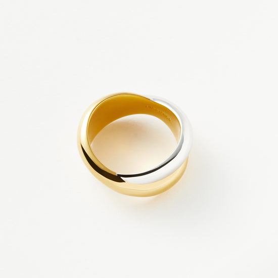 A classic, reimagined. This 80s maximalist statement ring features a unique crossover design with mixed metal gold and silver bands. Inspired by our best selling Lucy Williams Chunky Entwine Hoops. Just as standout on its own as it is as part of a ring stack.