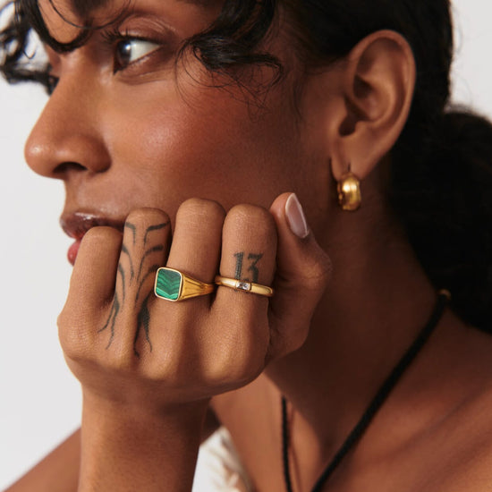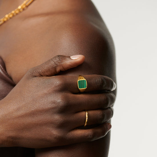 A unique, vintage-inspired take on the classic signet ring. The malachite gemstone is known for transformation. Style this signature piece solo, wear it on your pinky, or stack with more delicate styles.