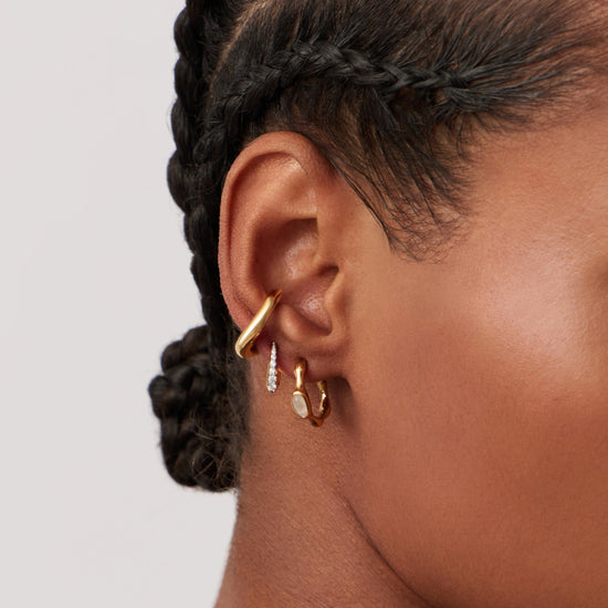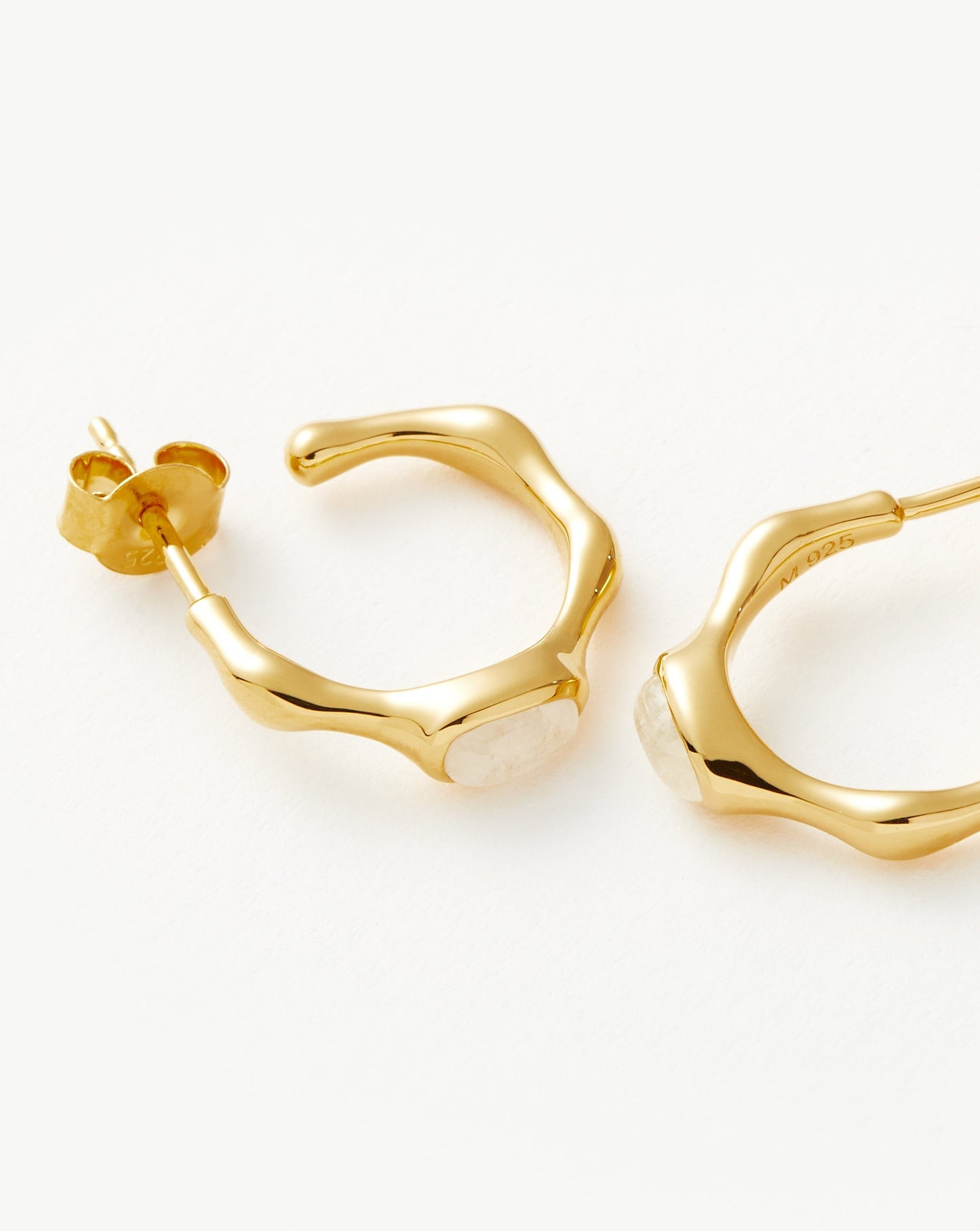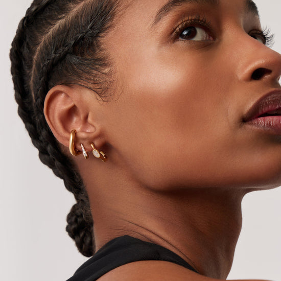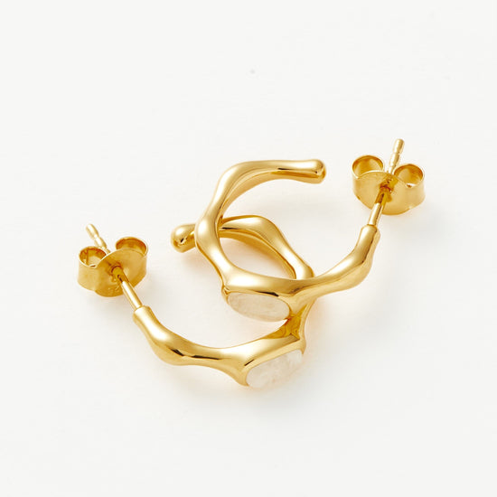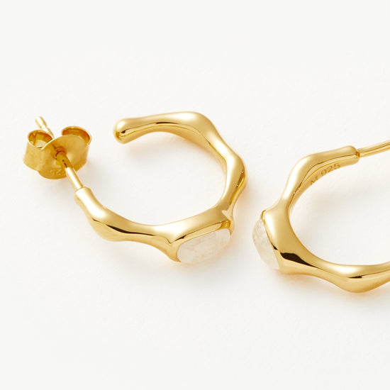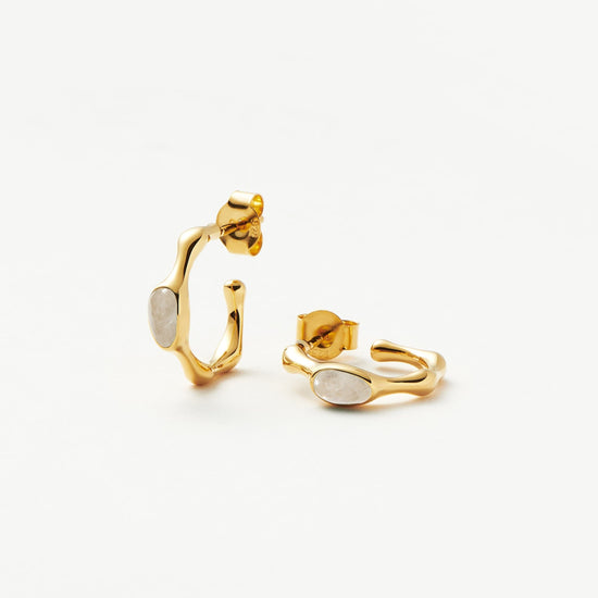 A symbol of new beginnings, rainbow moonstone meets molten in these small hoop earrings. Wear solo or stack with bold hoops for more maximalist styling.
