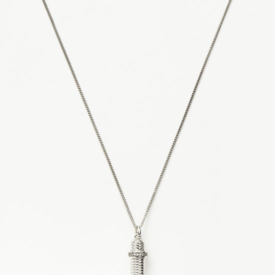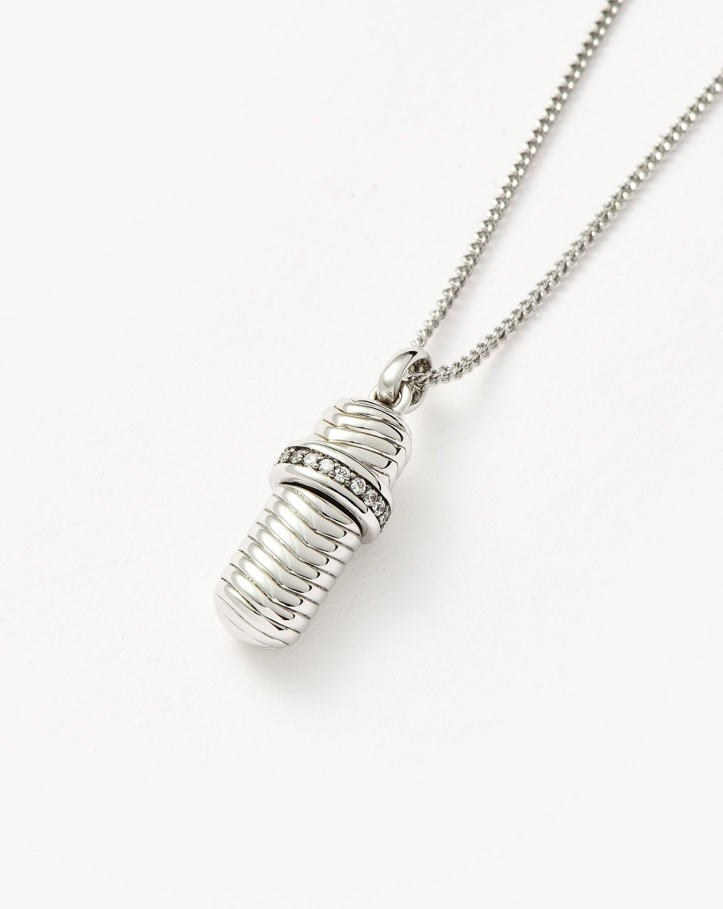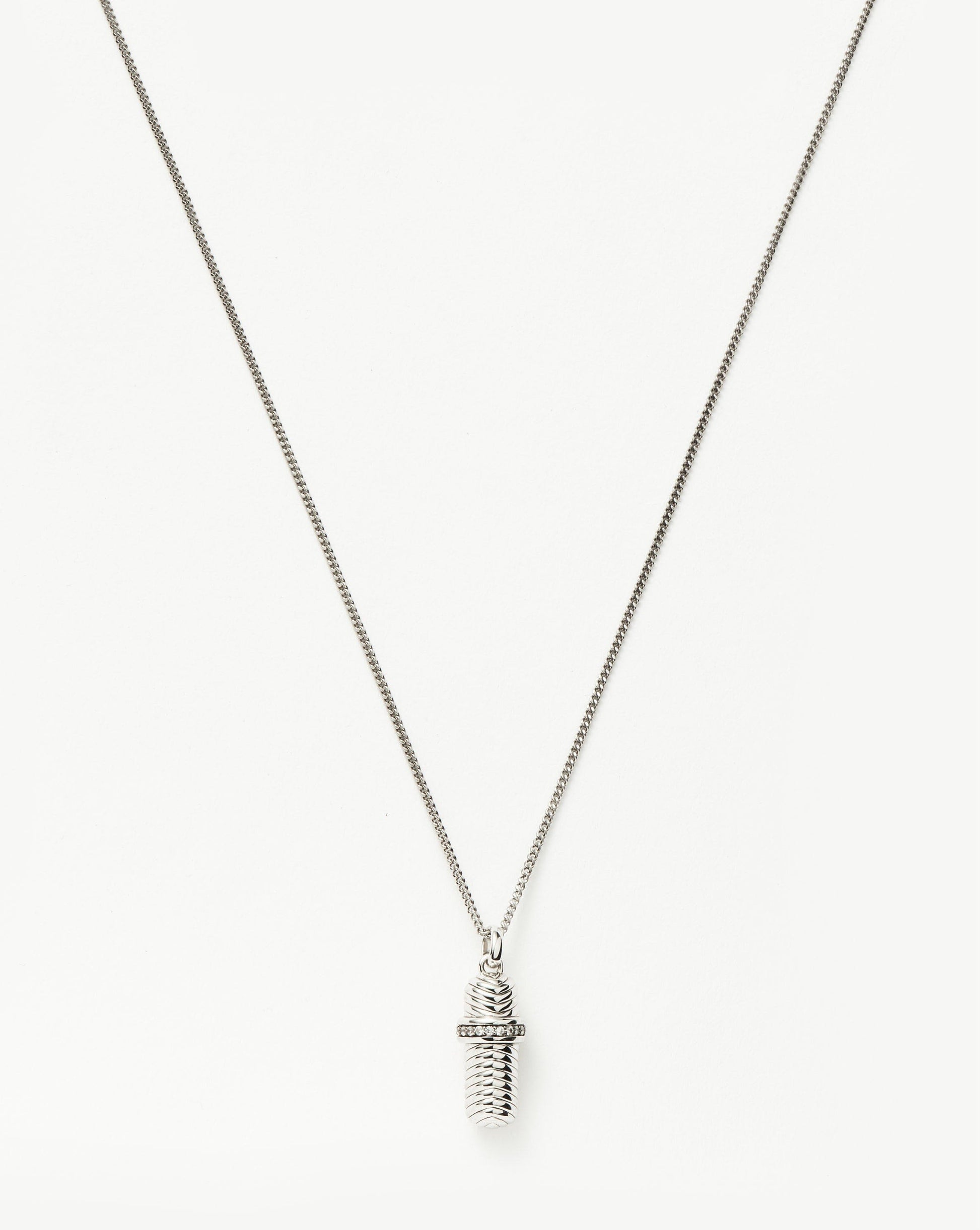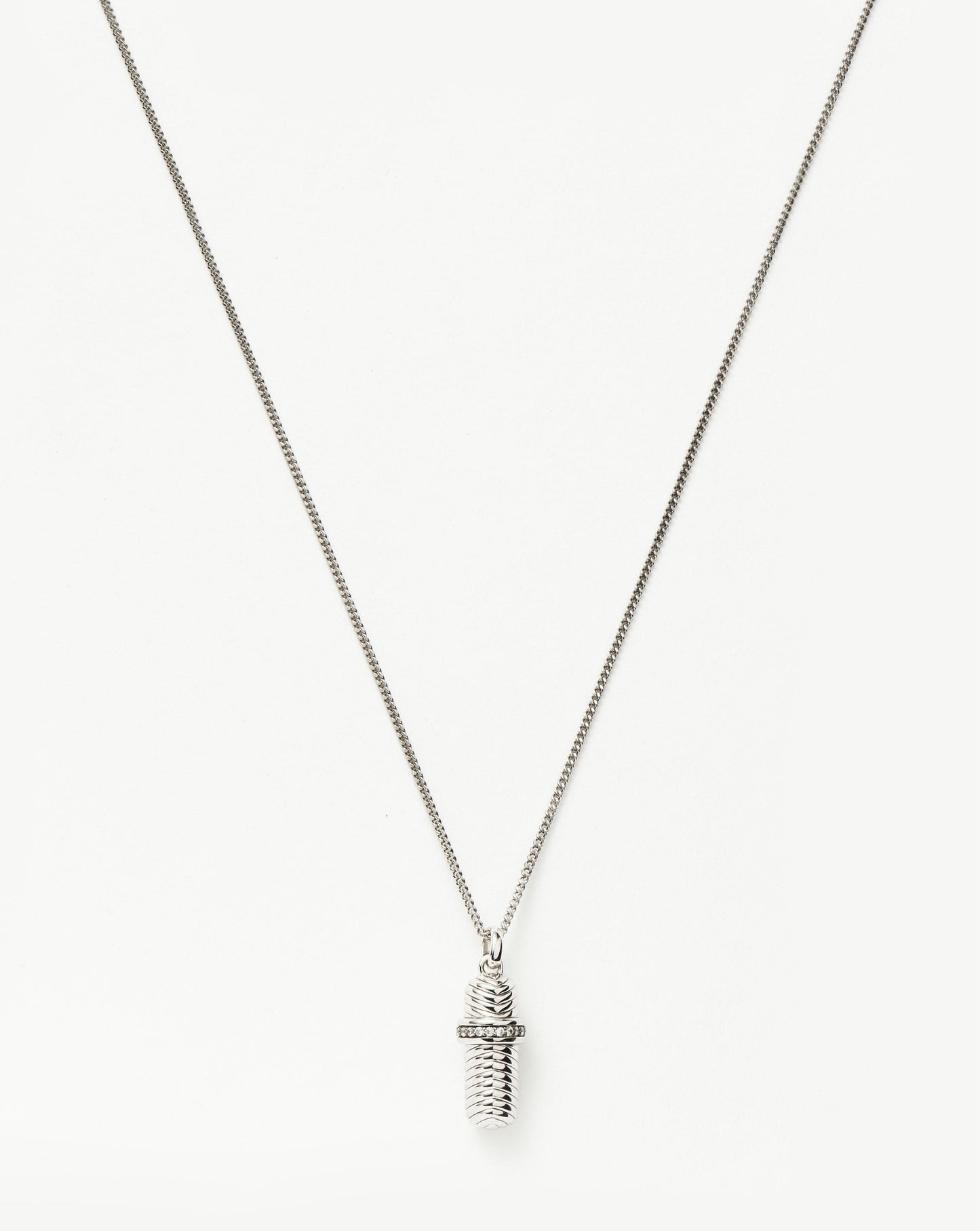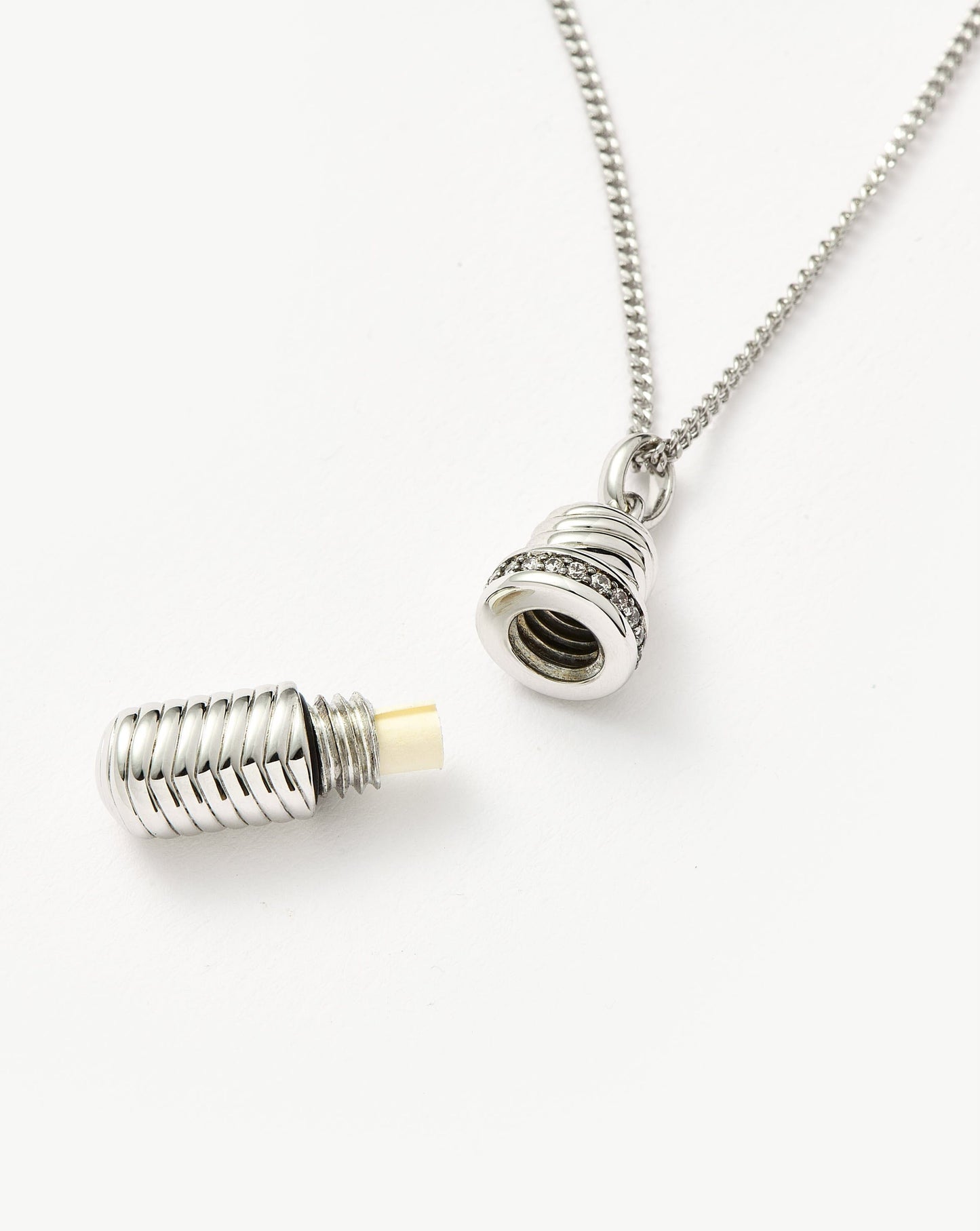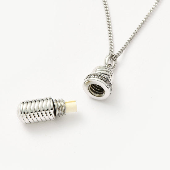 Make it personal with this modern-day love letter. Paired with a delicate mini curb chain, the ridged pendant features cubic zirconia detailing. Unscrew the top to reveal a hidden scroll of parchment paper on which you (or someone else) can write a message. Wear it solo, close to your heart, or team with a longer necklace for a layered look.