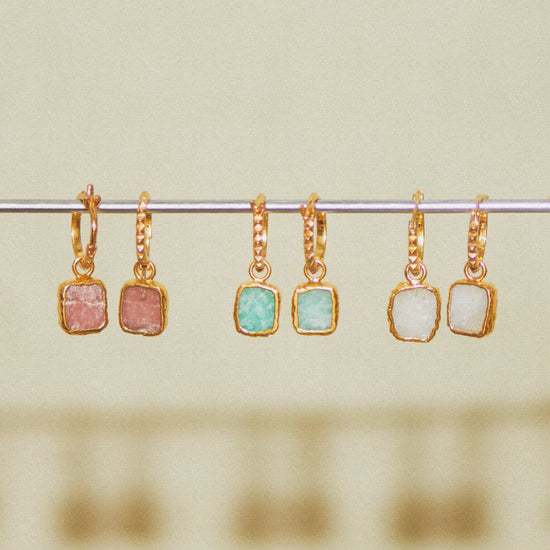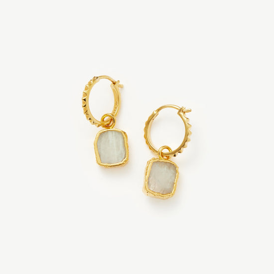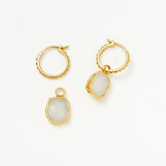 This piece contains a natural gemstone which may vary slightly in color and markings from the stone shown in the image. Be careful not to drop them or hit them against anything as they may break. Store them in their pouch or box to keep them protected. Remove the charms to wear the hoops solo.