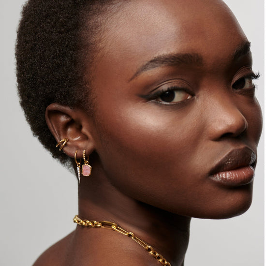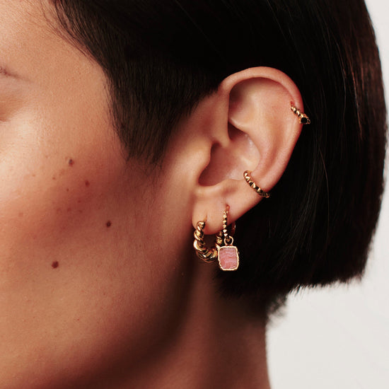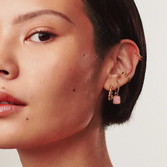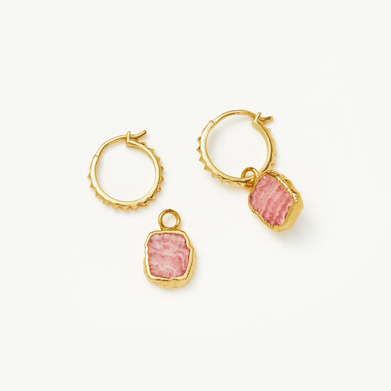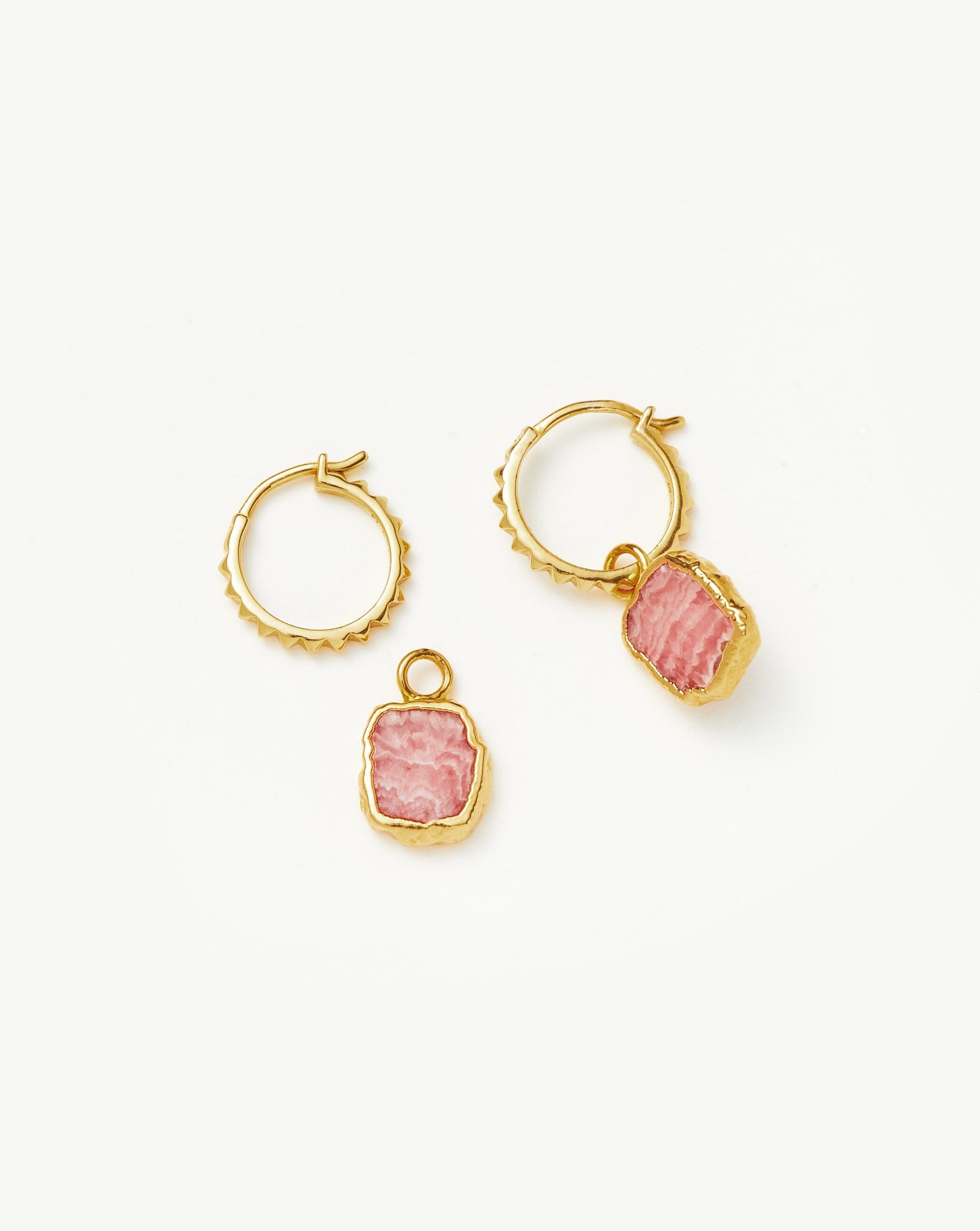 Power of the pyramid. Expertly handcrafted, these unique best selling earrings feature rhodochrosite gemstones – known as a symbol of love – suspended from pared back hoops with a pyramid design. Create contrast by teaming with delicate huggies. Remove the charms to wear the hoops solo.