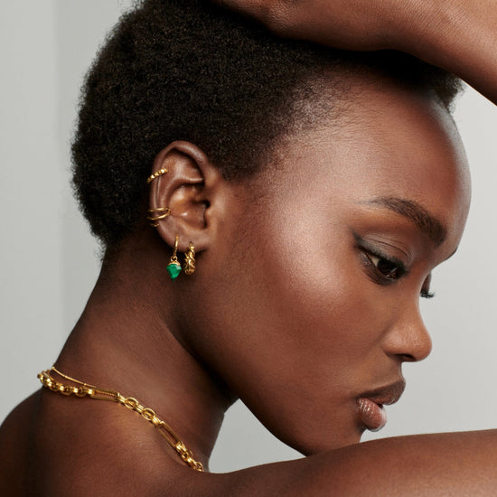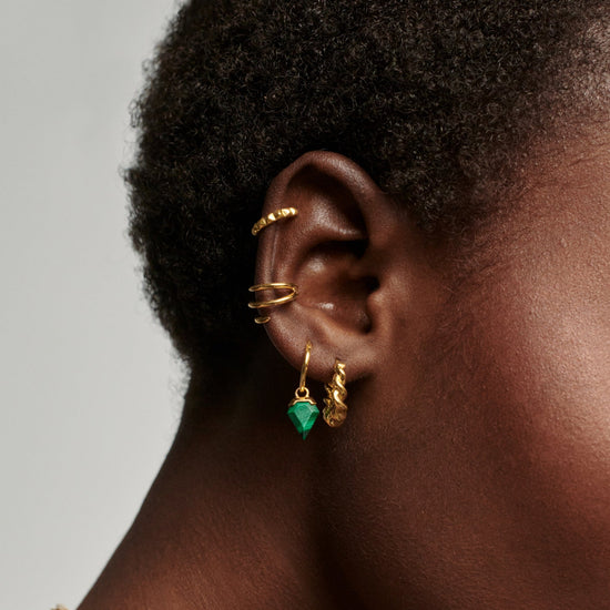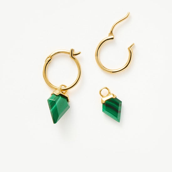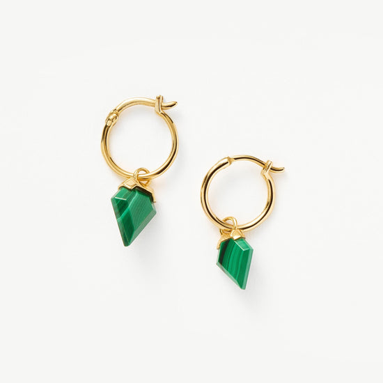 Your ear stack, upgraded. Suspended from small pared back hoops, two malachite stones – known for transformation – in unique diamond shapes stand out from their smooth settings. Wear solo or contrast with a plain stud for added impact.