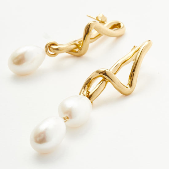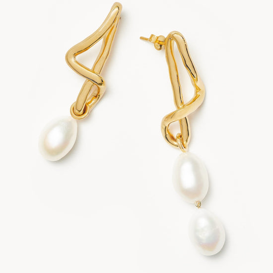Iconic pearls for everyone. These asymmetric mismatched earrings feature an organic twist on our classic ovate hoop, with a single drop baroque pearl on one side and two on the other. A statement hoop inspired by music notes.