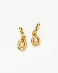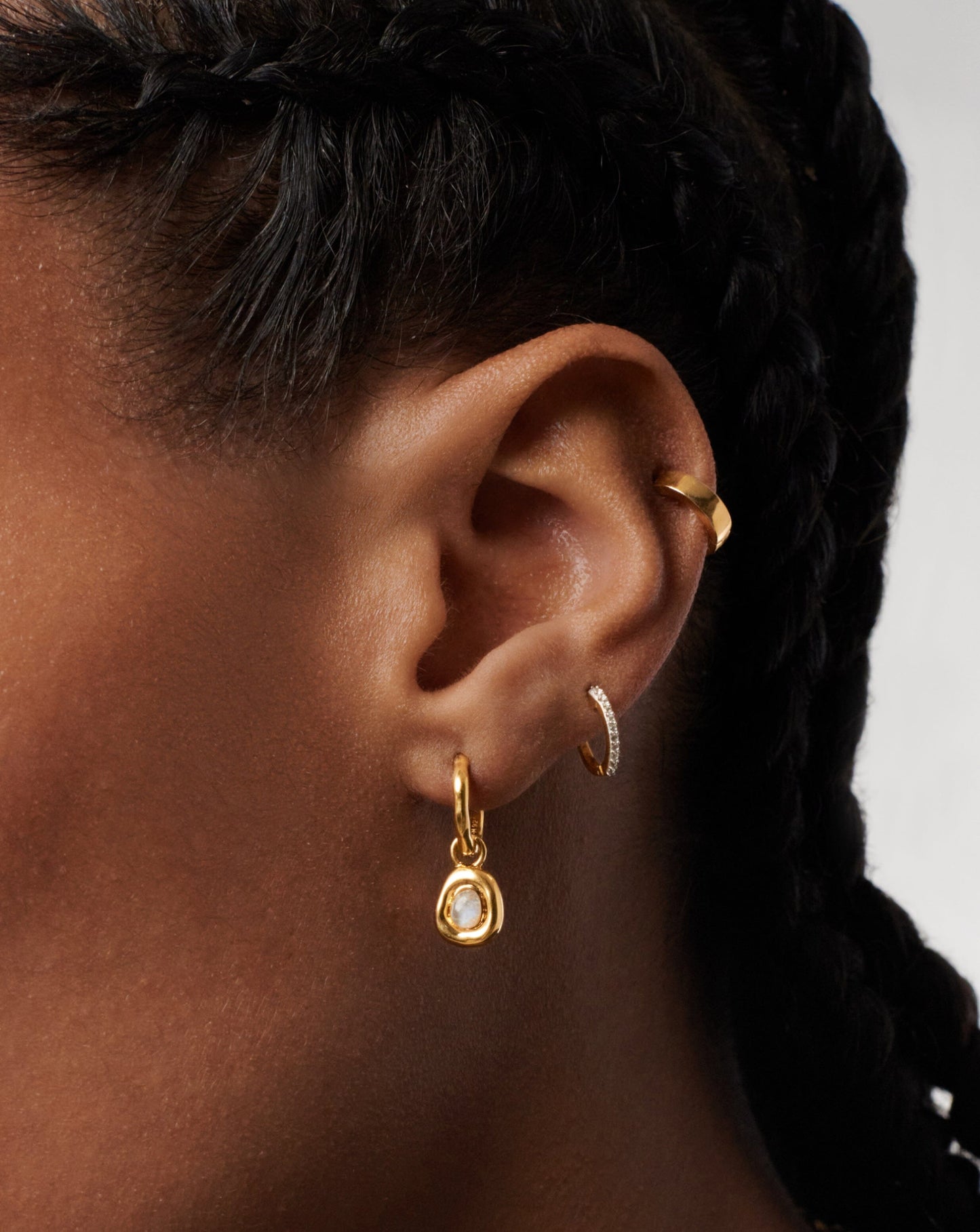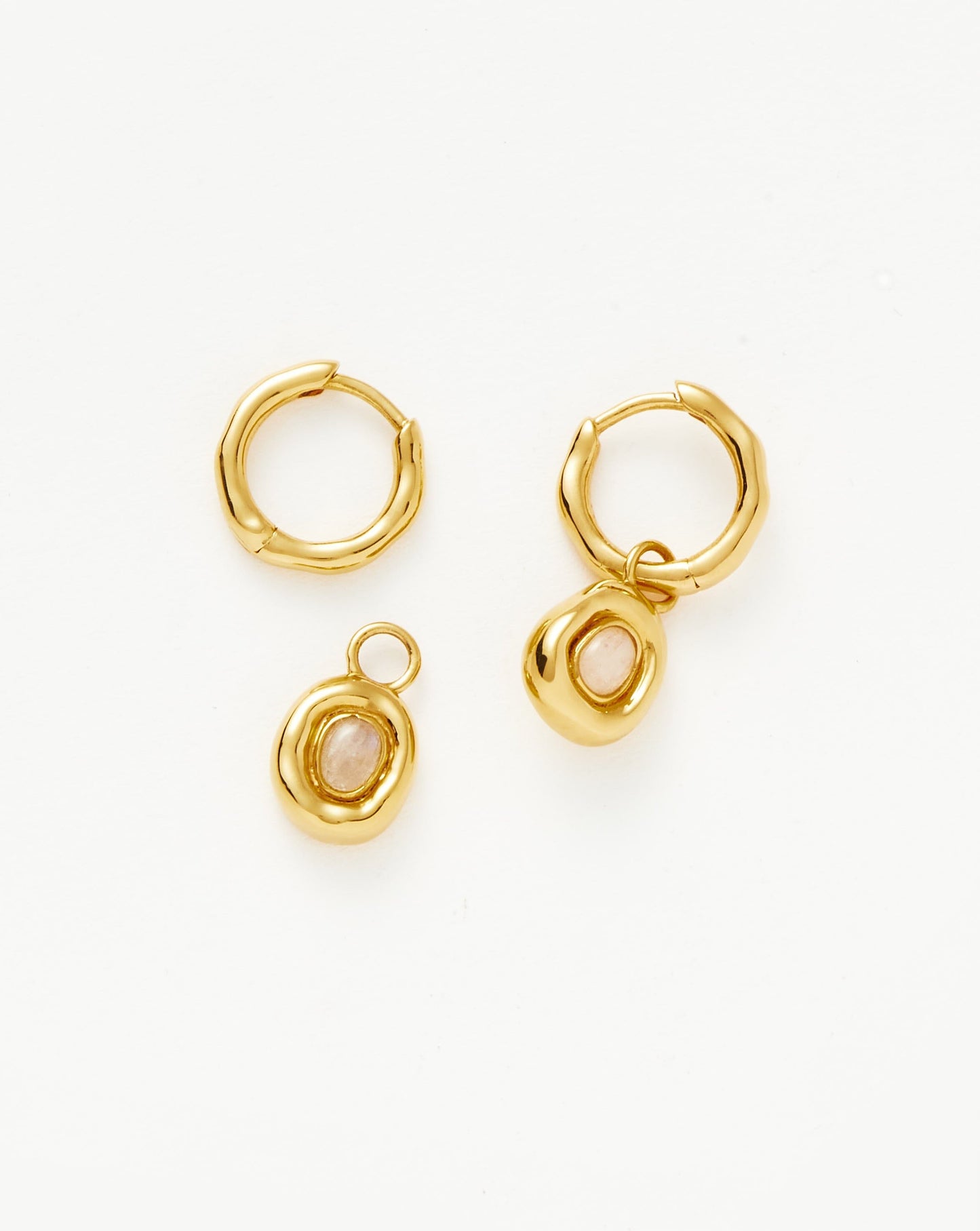 These mini charm hoops feature rainbow moonstone gemstones – symbolising new beginnings – suspended from small molten hinged hoops. Two earrings in one, you can remove the charms to wear as plain huggies. Remove the charms to wear the hoops solo.