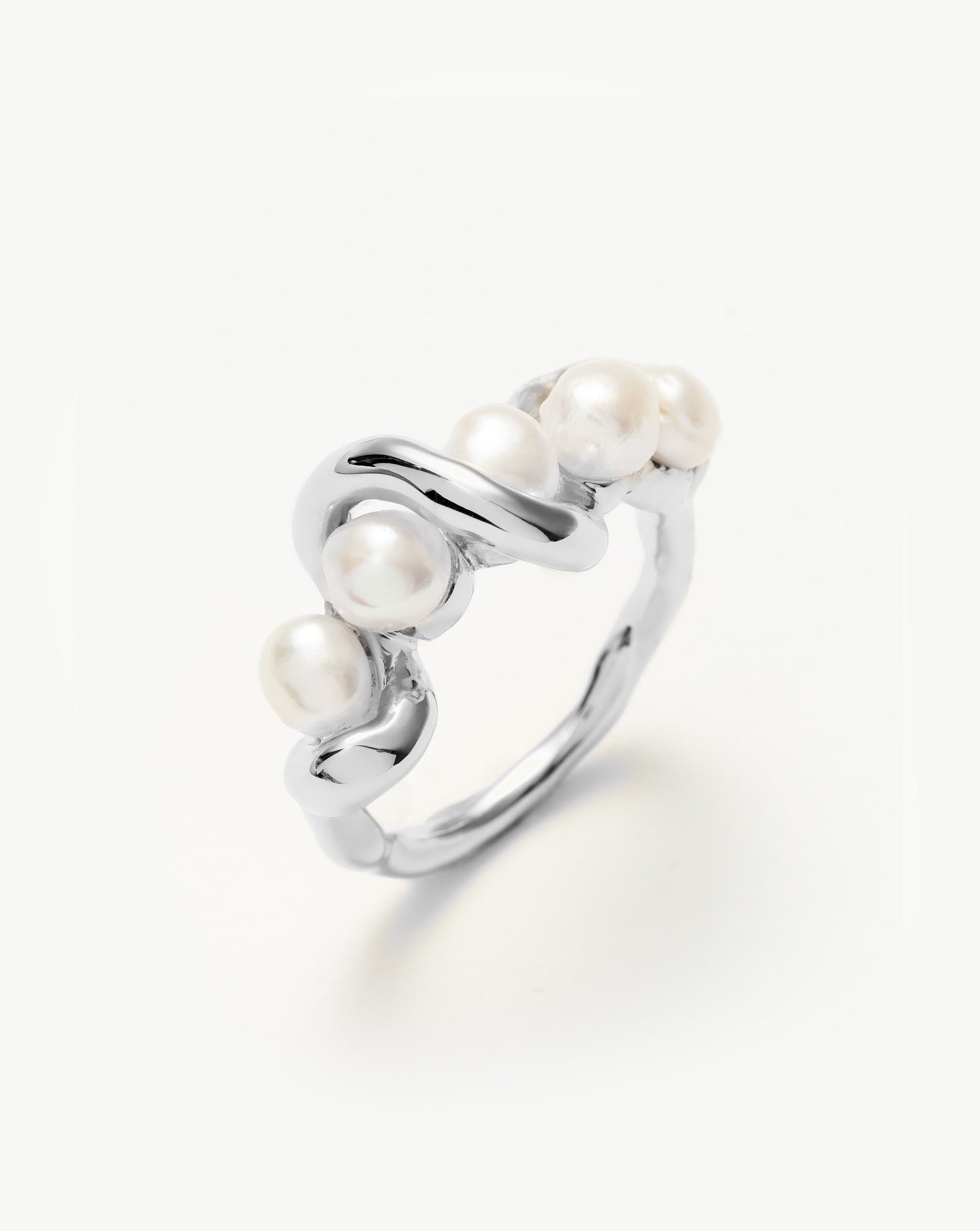 Iconic pearls for everyone. This pearl statement ring features a molten band twisted around beaded freshwater pearls, said to bring wisdom and knowledge. Style with other simple bands for a clashing ring stack.