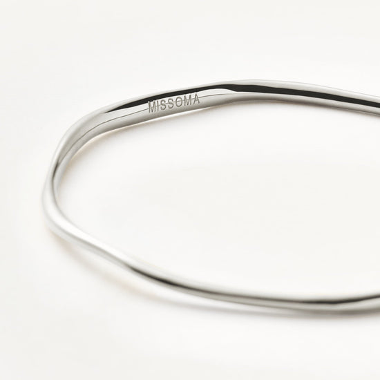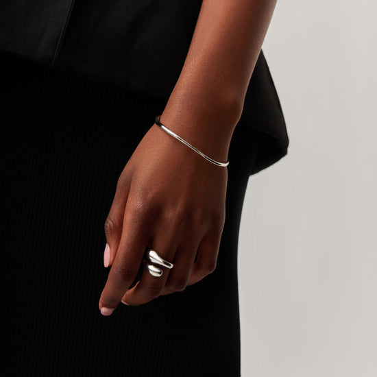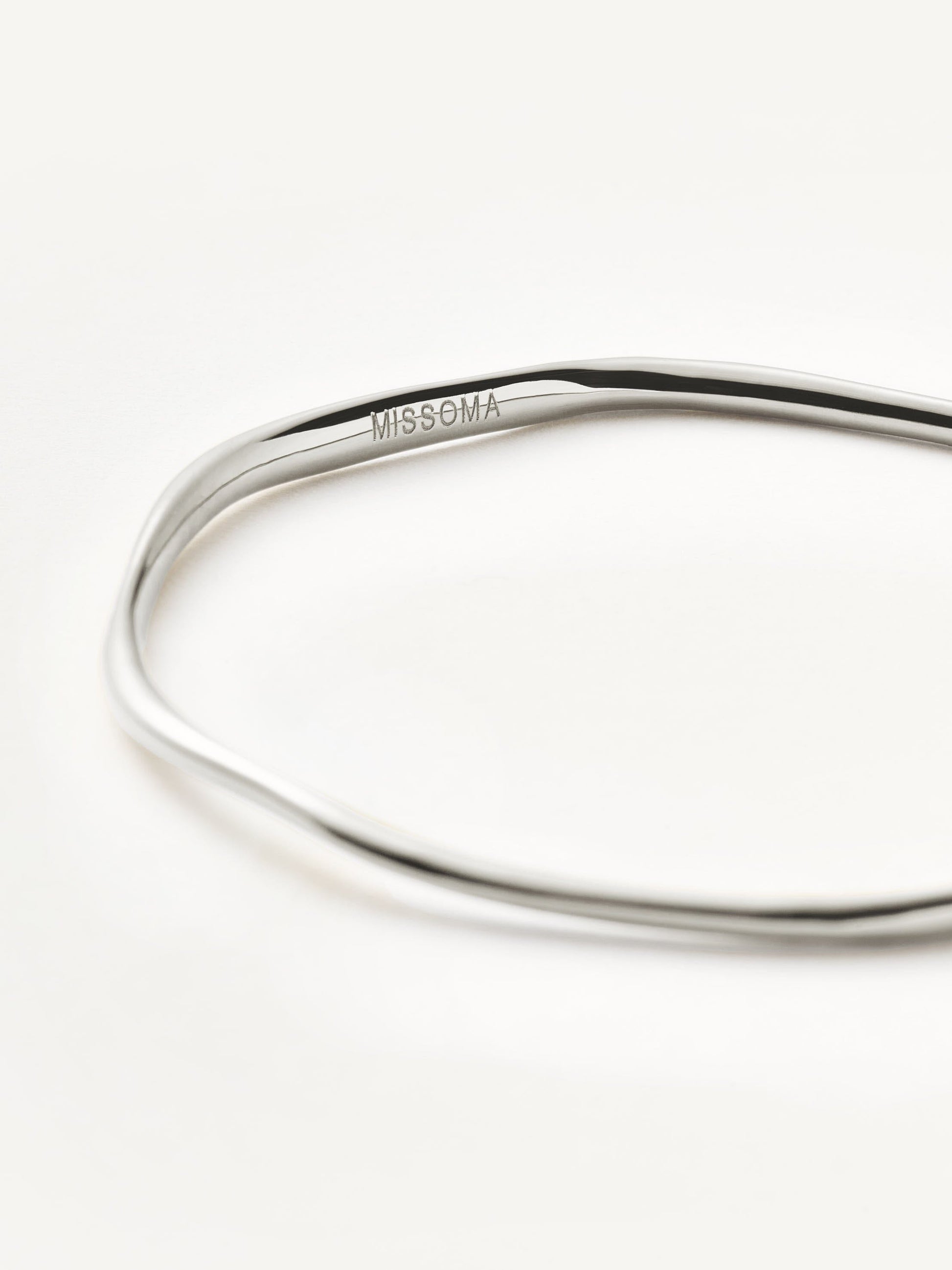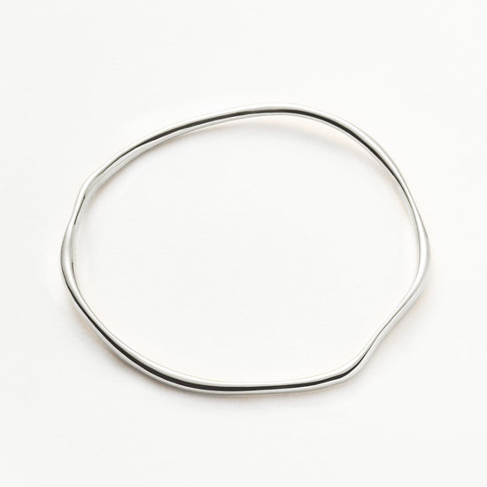This delicate bangle bracelet features an organic-inspired shape with our signature molten wavy detailing. Designed to slide on easily, wear solo or pair with chunky chains to create a bold arm stack.