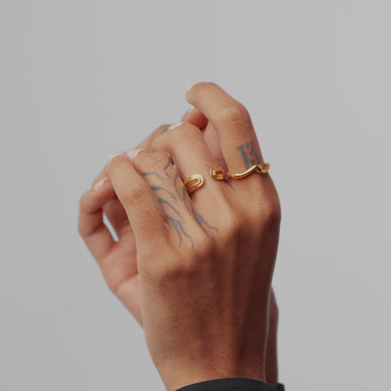This gold ovate open ring wraps around the finger, featuring signature ridge detailing. Wear solo or alongside textured gold rings for contrast.