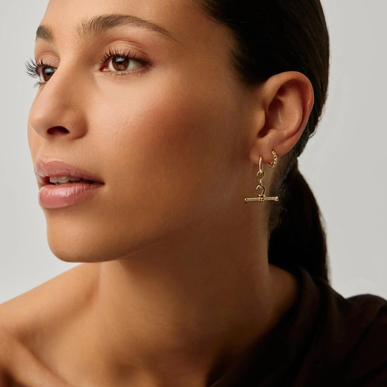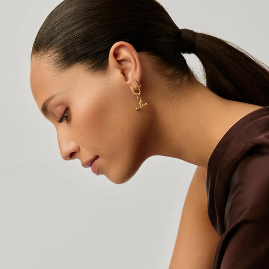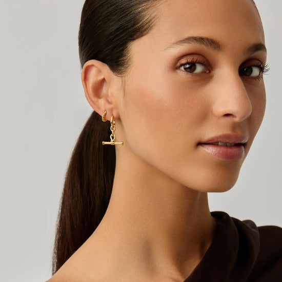 These huggie earrings feature distinctive t-bar charms with our signature ridge detailing. Remove the charms to wear the huggies solo, or style up with mini hoops and studs for an instant ear stack.