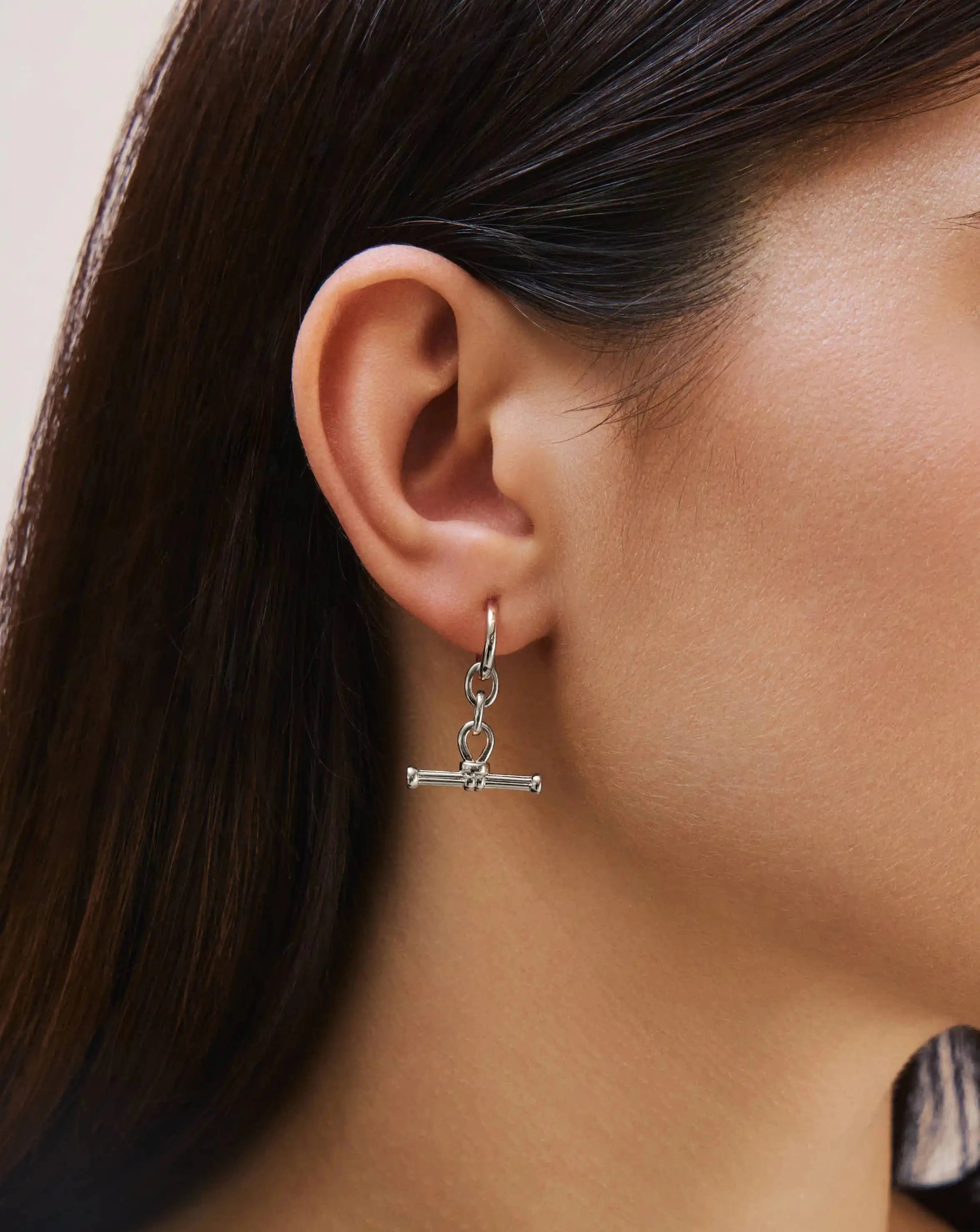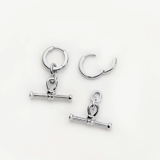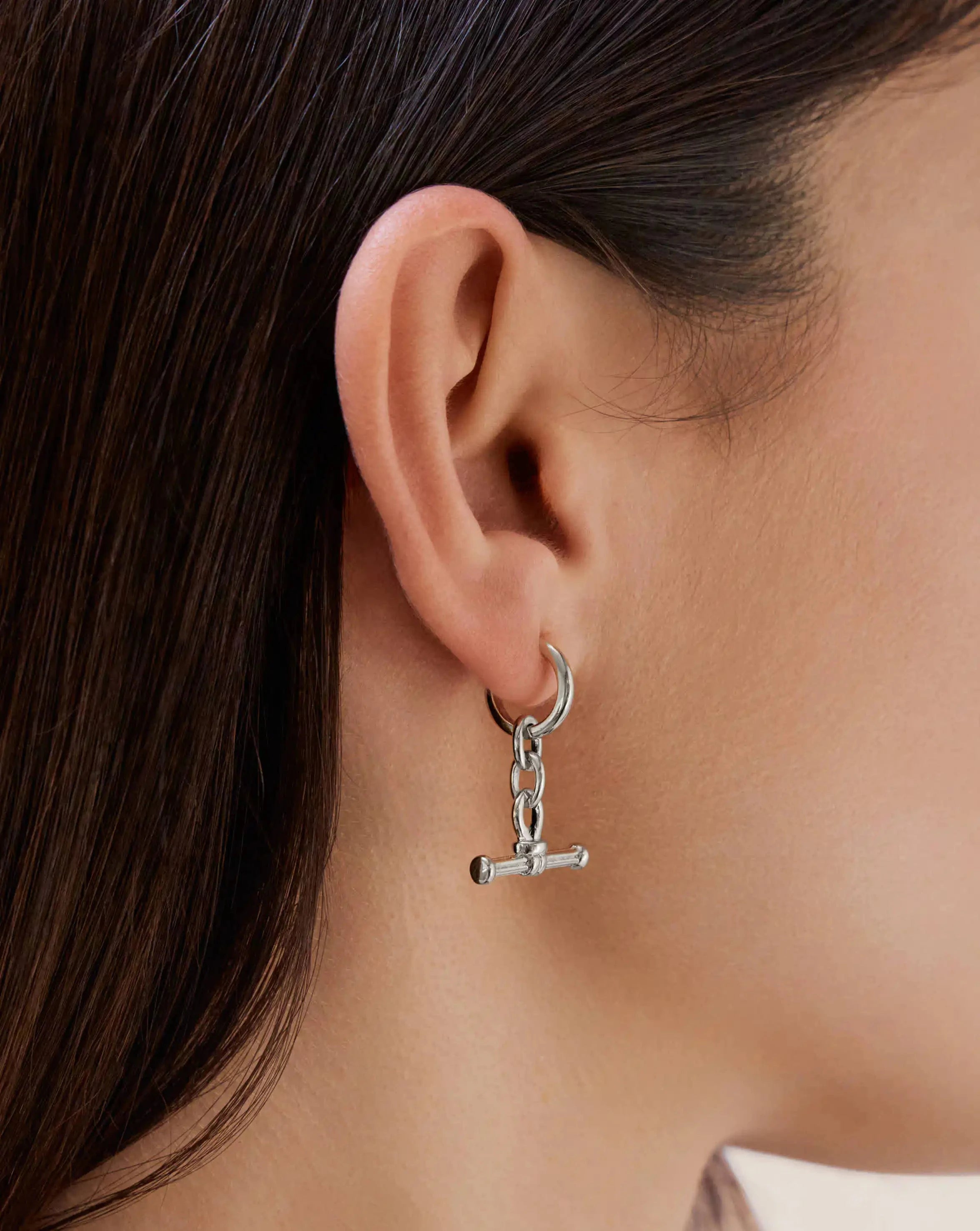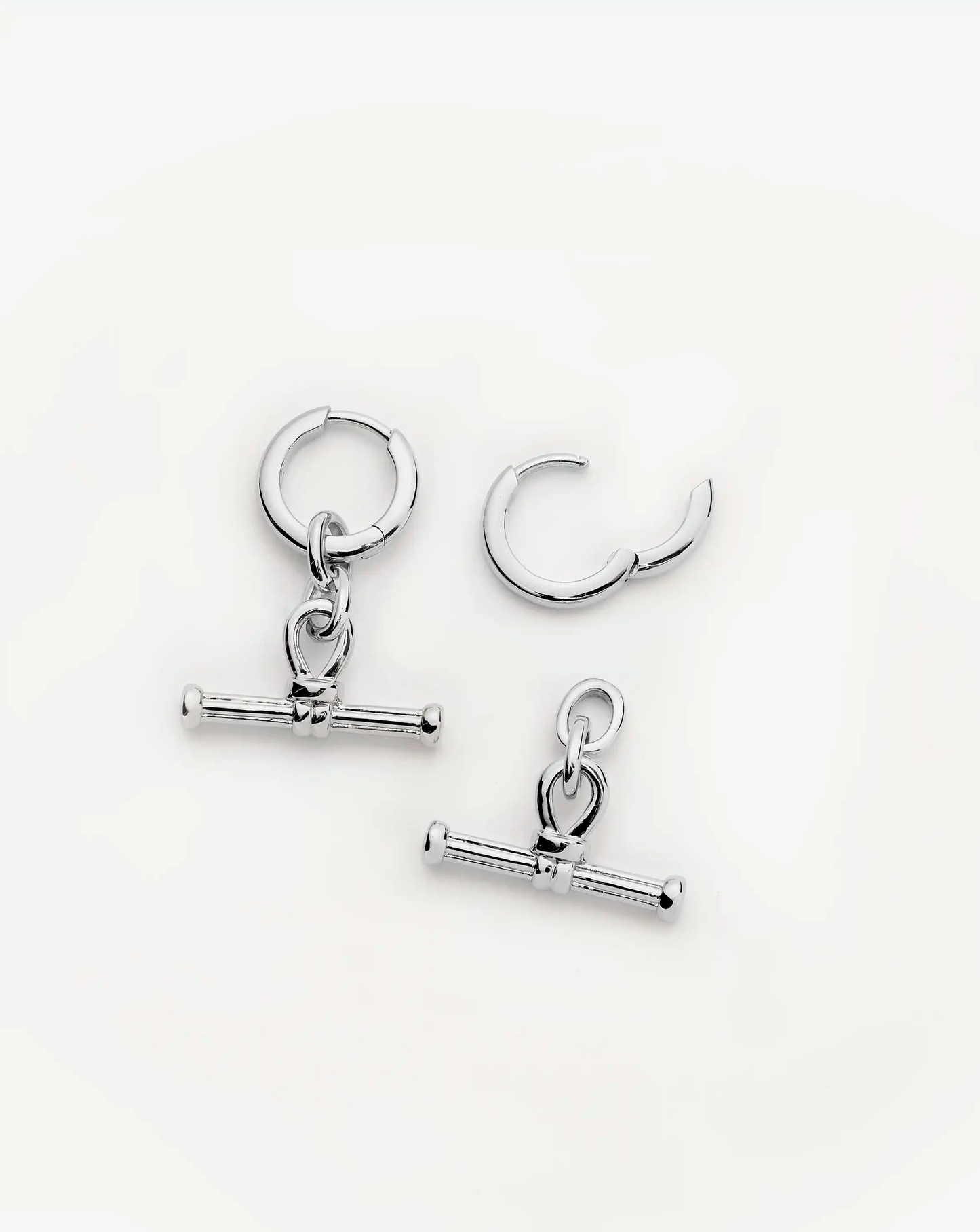 These huggie earrings feature distinctive t-bar charms with our signature ridge detailing. Remove the charms to wear the huggies solo, or style up with mini hoops and studs for an instant ear stack.