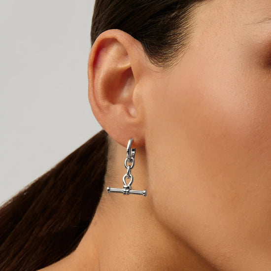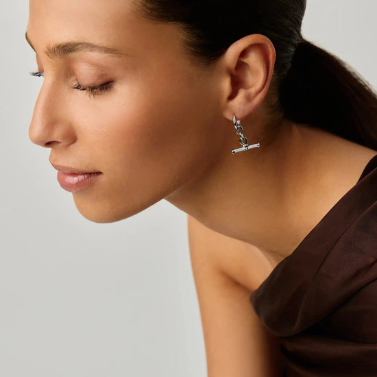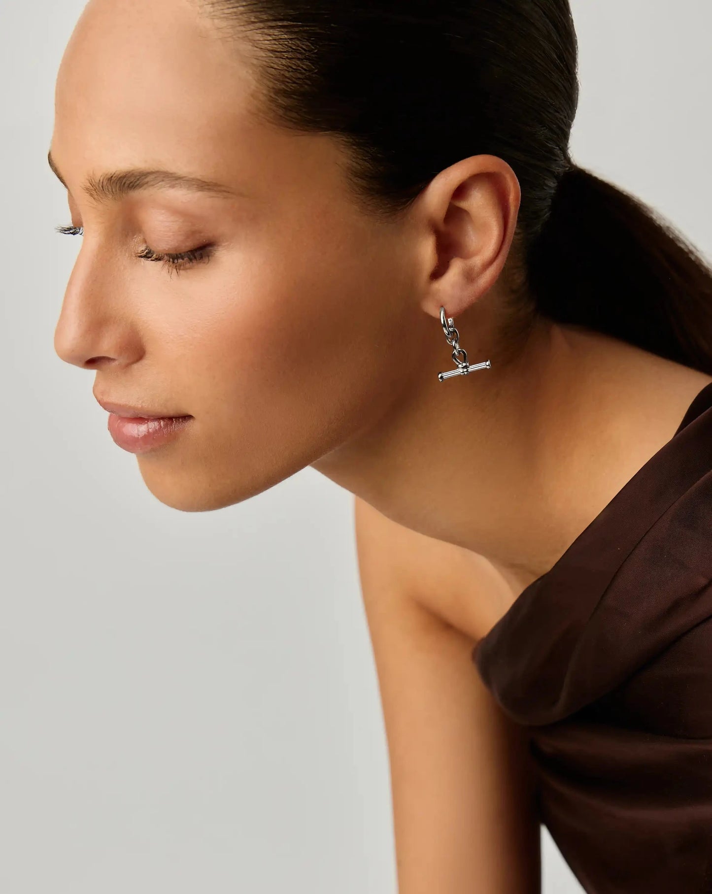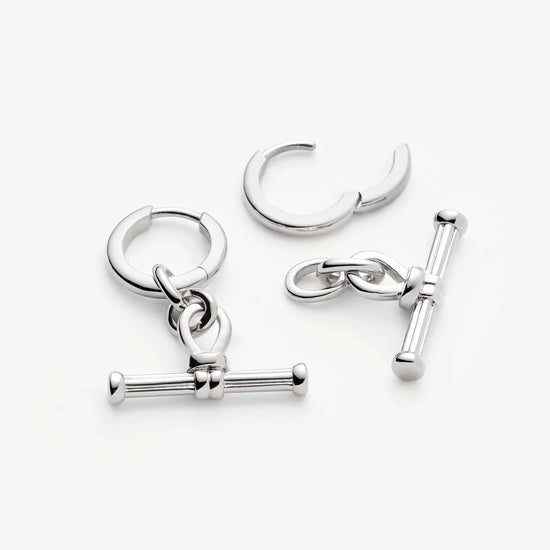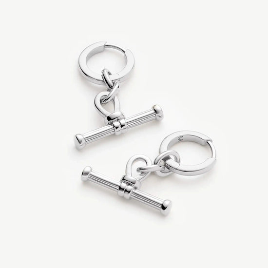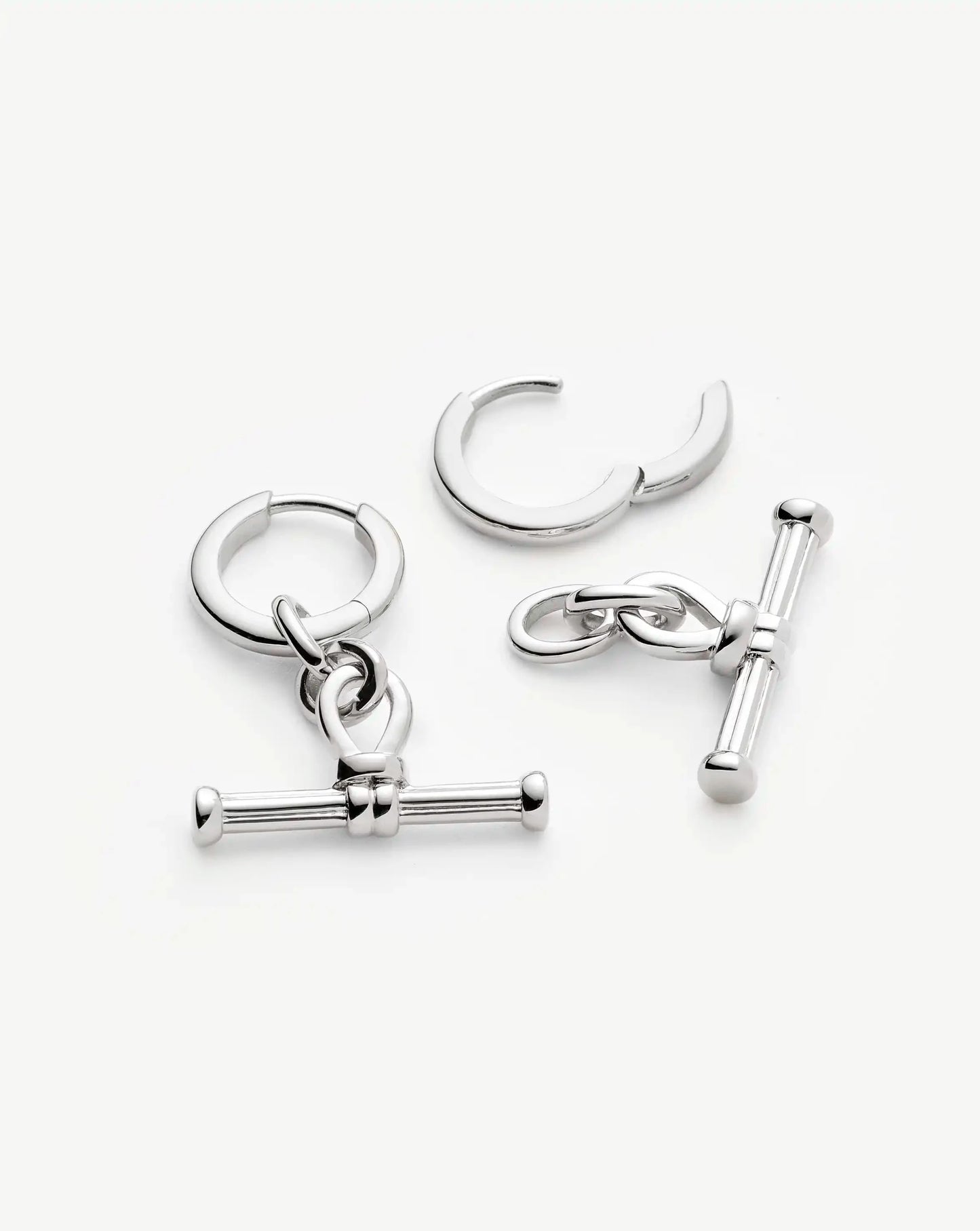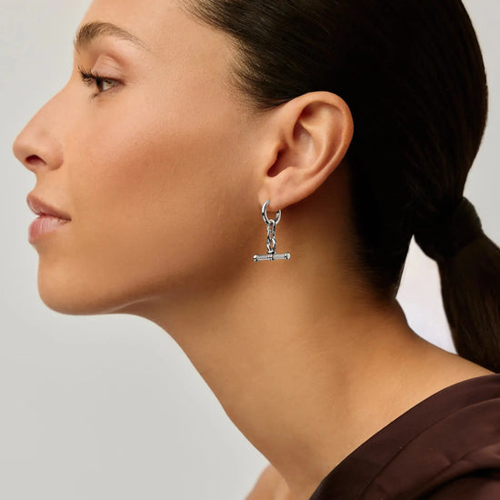 These huggie earrings feature distinctive t-bar charms with our signature ridge detailing. Remove the charms to wear the huggies solo, or style up with mini hoops and studs for an instant ear stack.