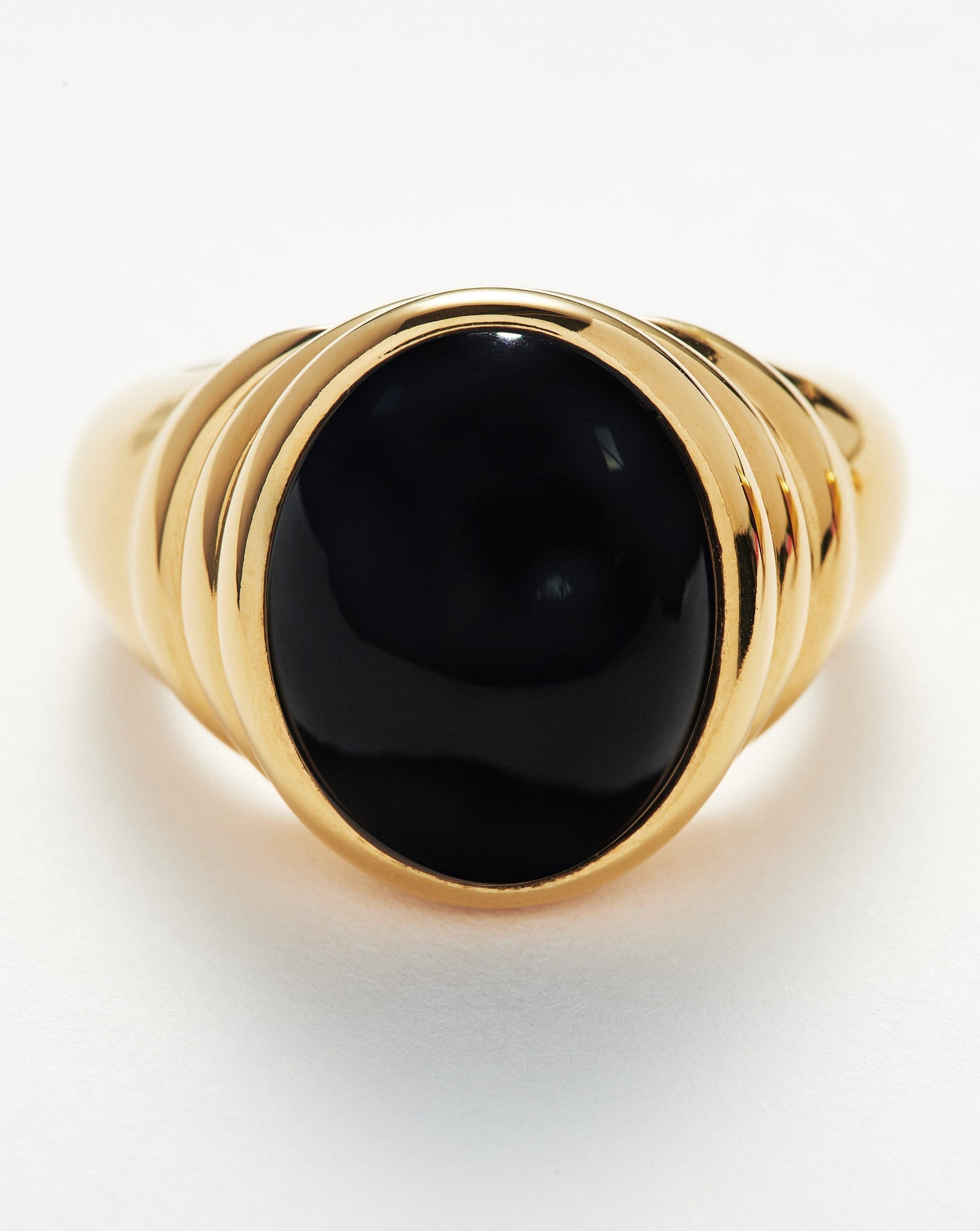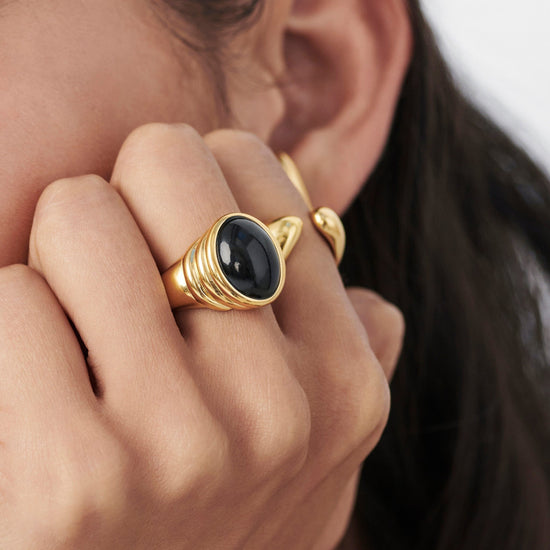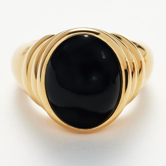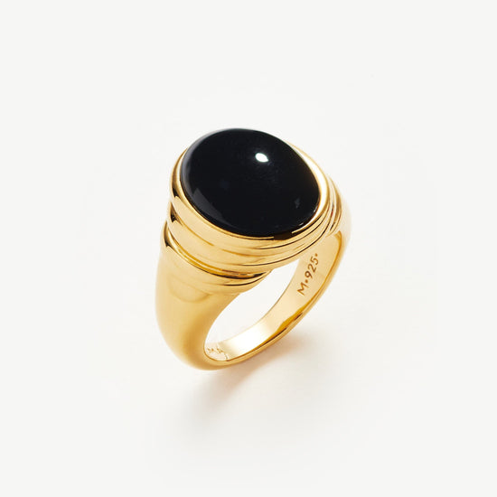 Pared-back modern meets vintage. This dome statement ring is embellished with a raised black onyx cabochon gemstone, surrounded by triple ridge detailing on a smooth chunky band.