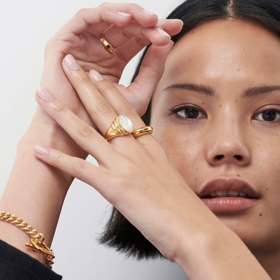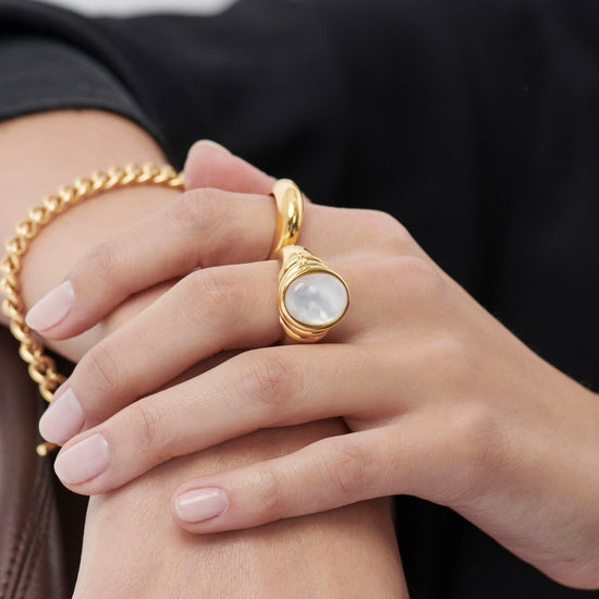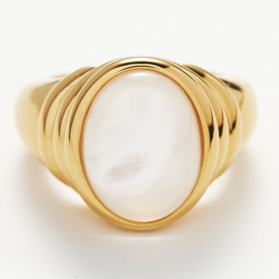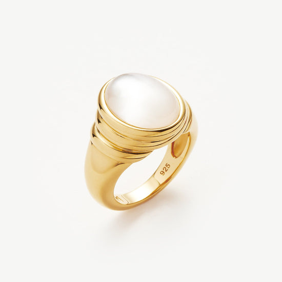 Pared-back modern meets vintage. This dome statement ring is embellished with a raised mother of pearl oval doublet stone that features a top layer of crystal quartz to create an iridescent finish. Surrounded by triple ridge detailing on a smooth chunky band.